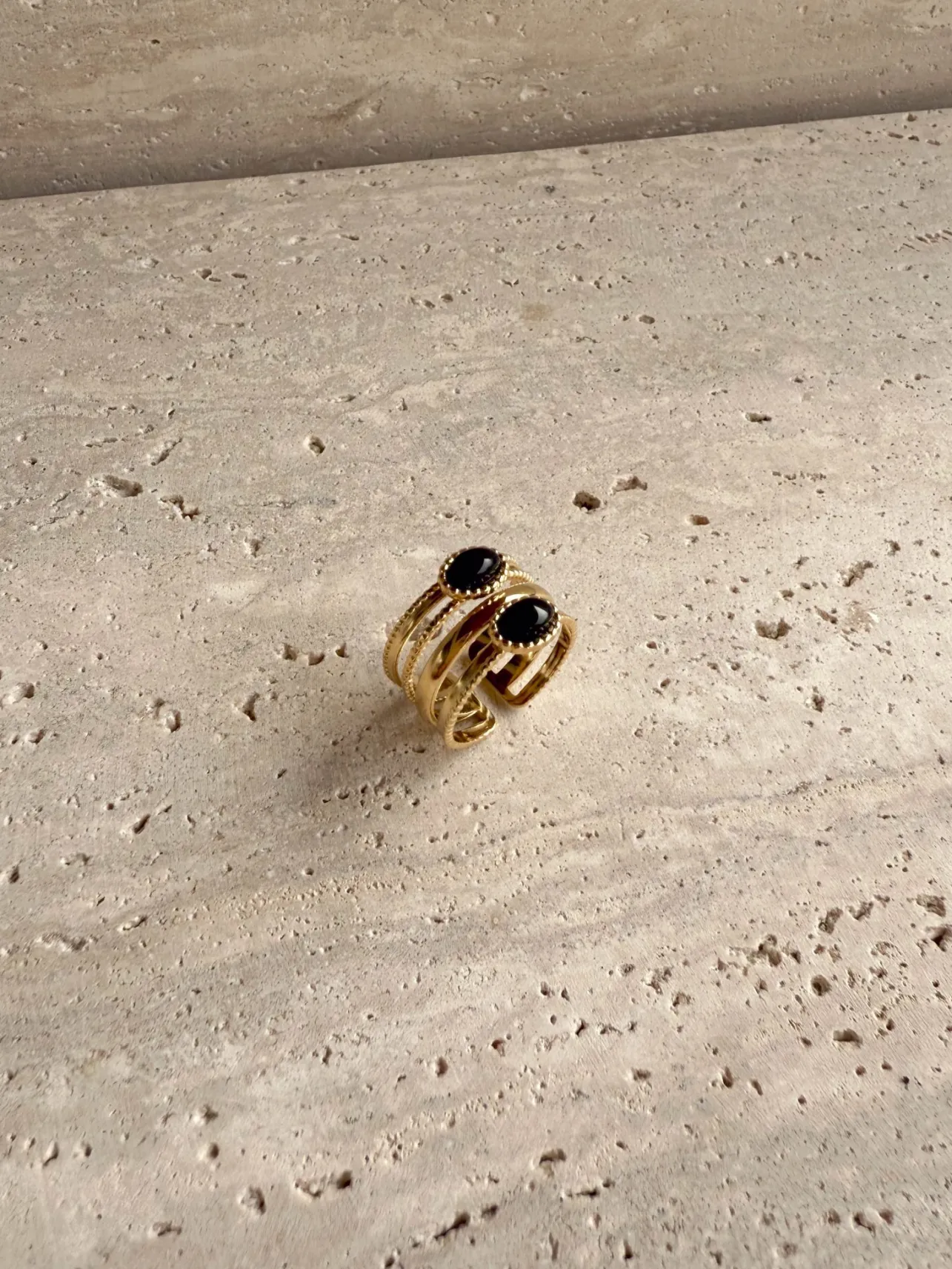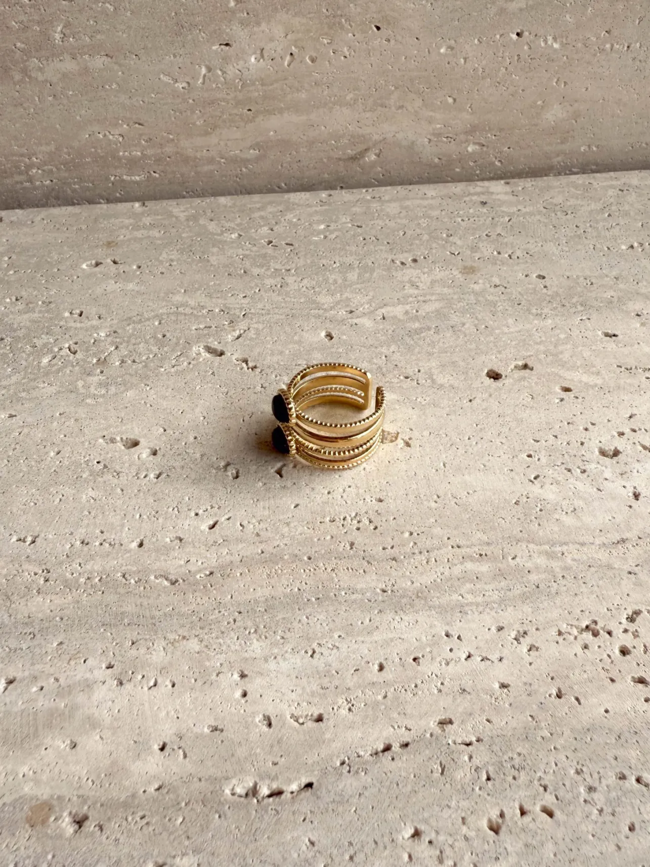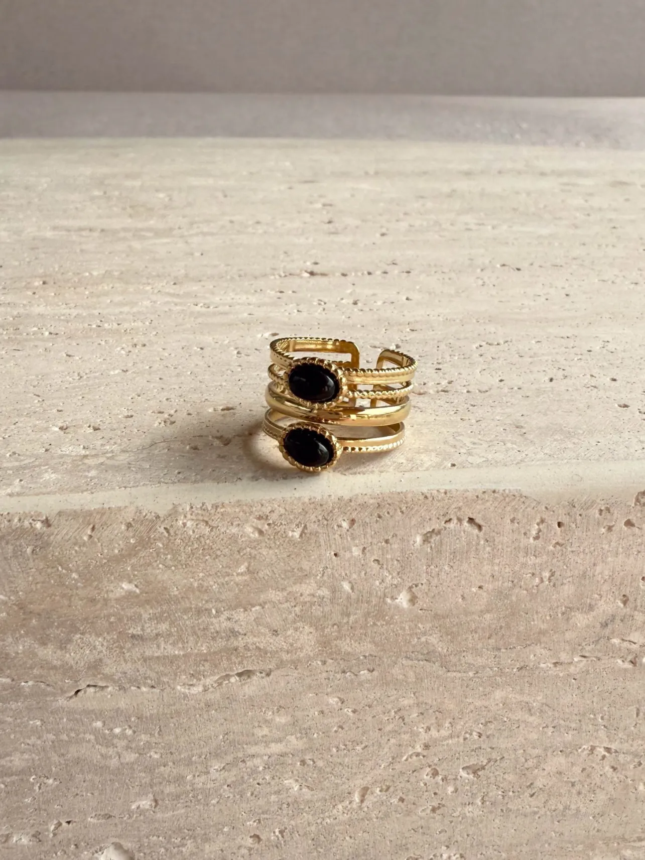 – Bague ouverte ajustable– Quatre anneaux ouverts– ornée de deux pierres noires– En acier inoxy…