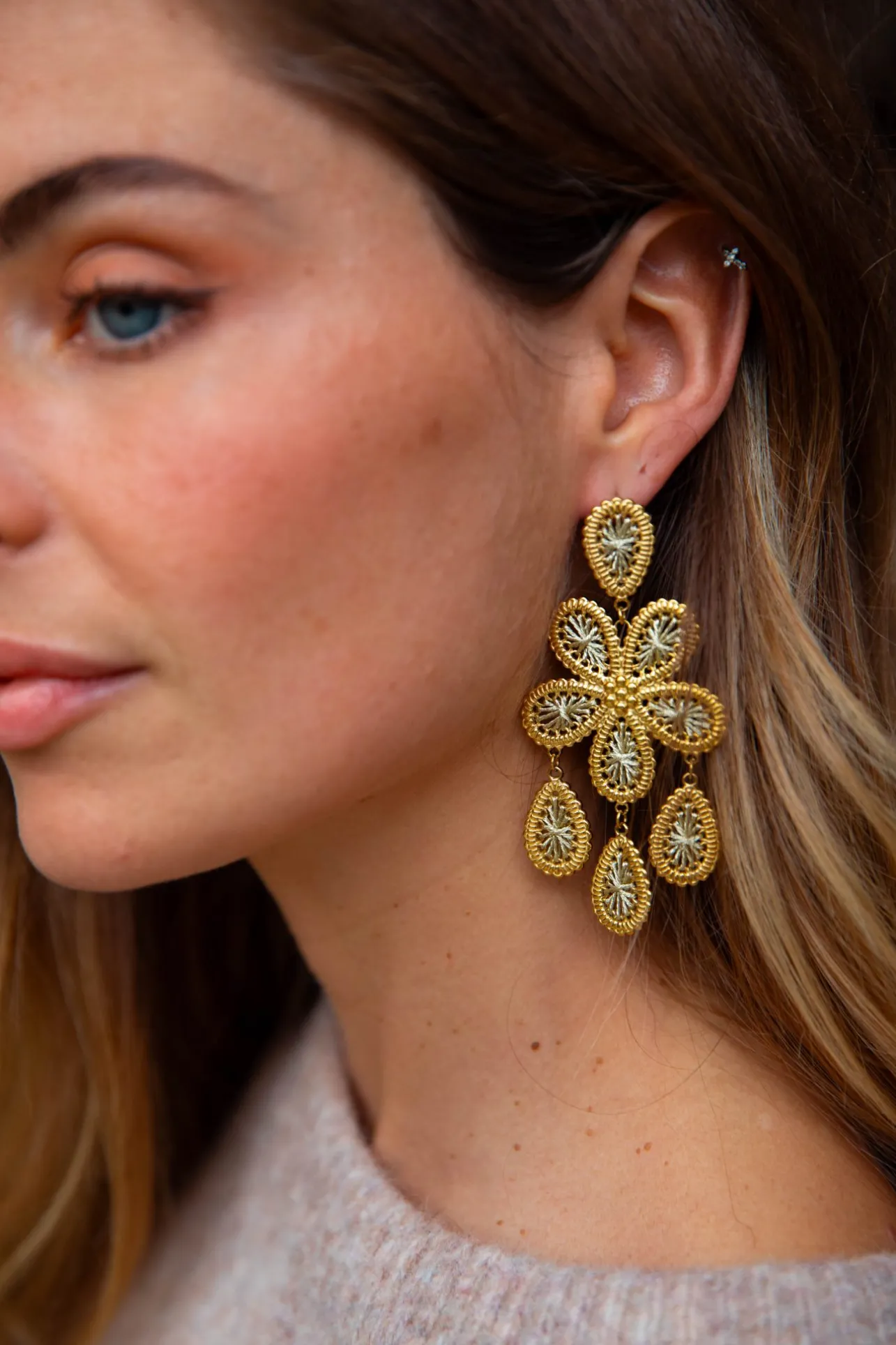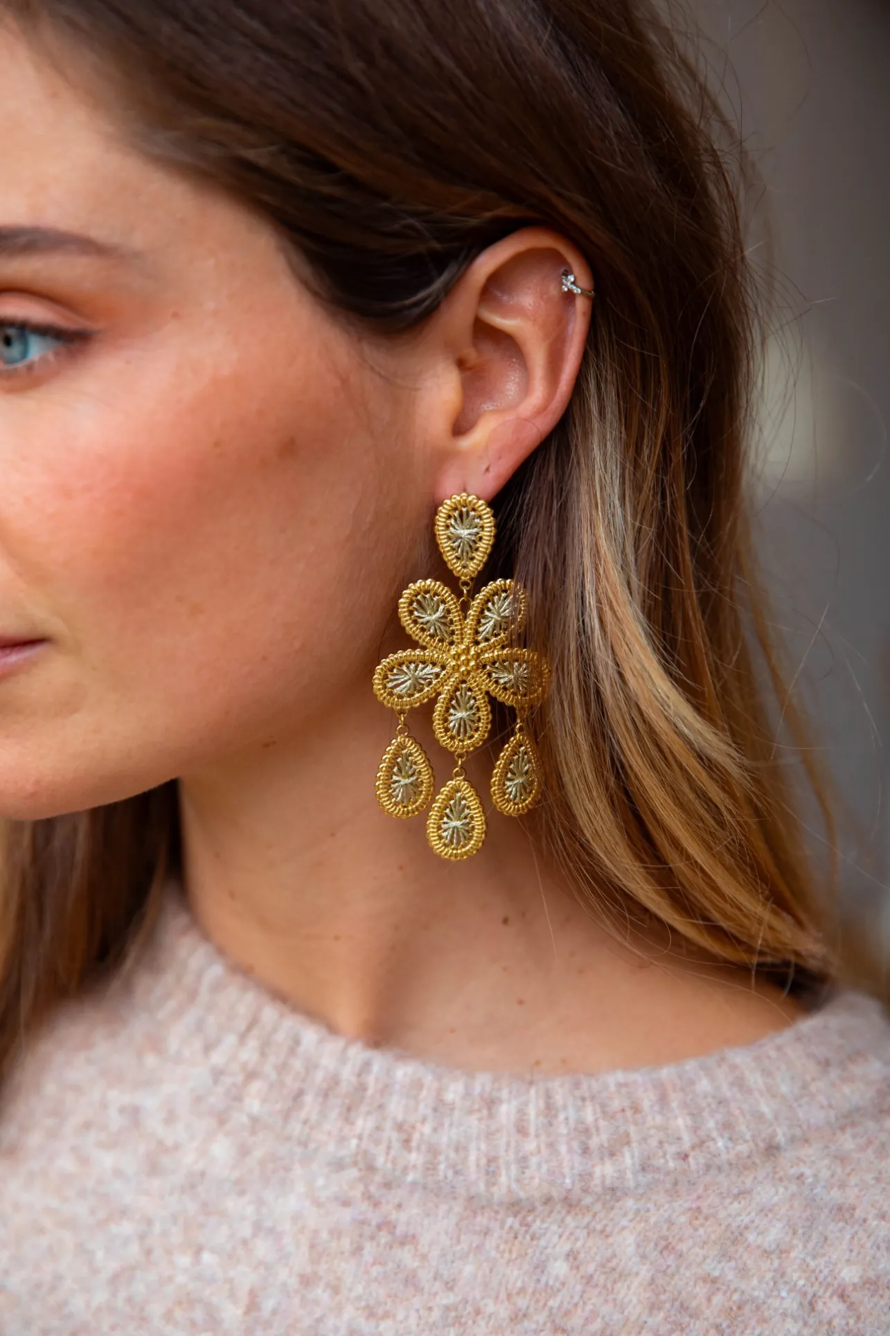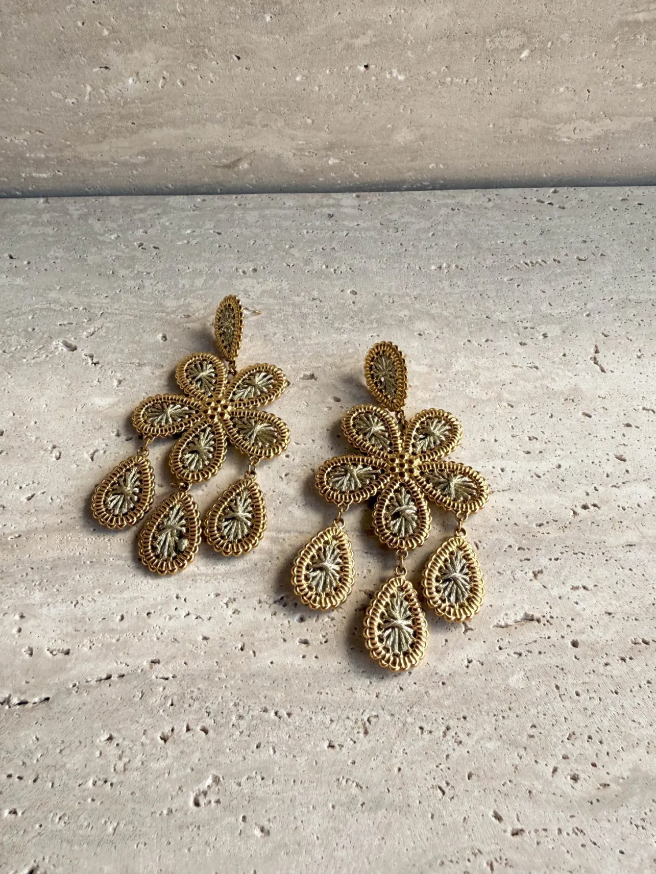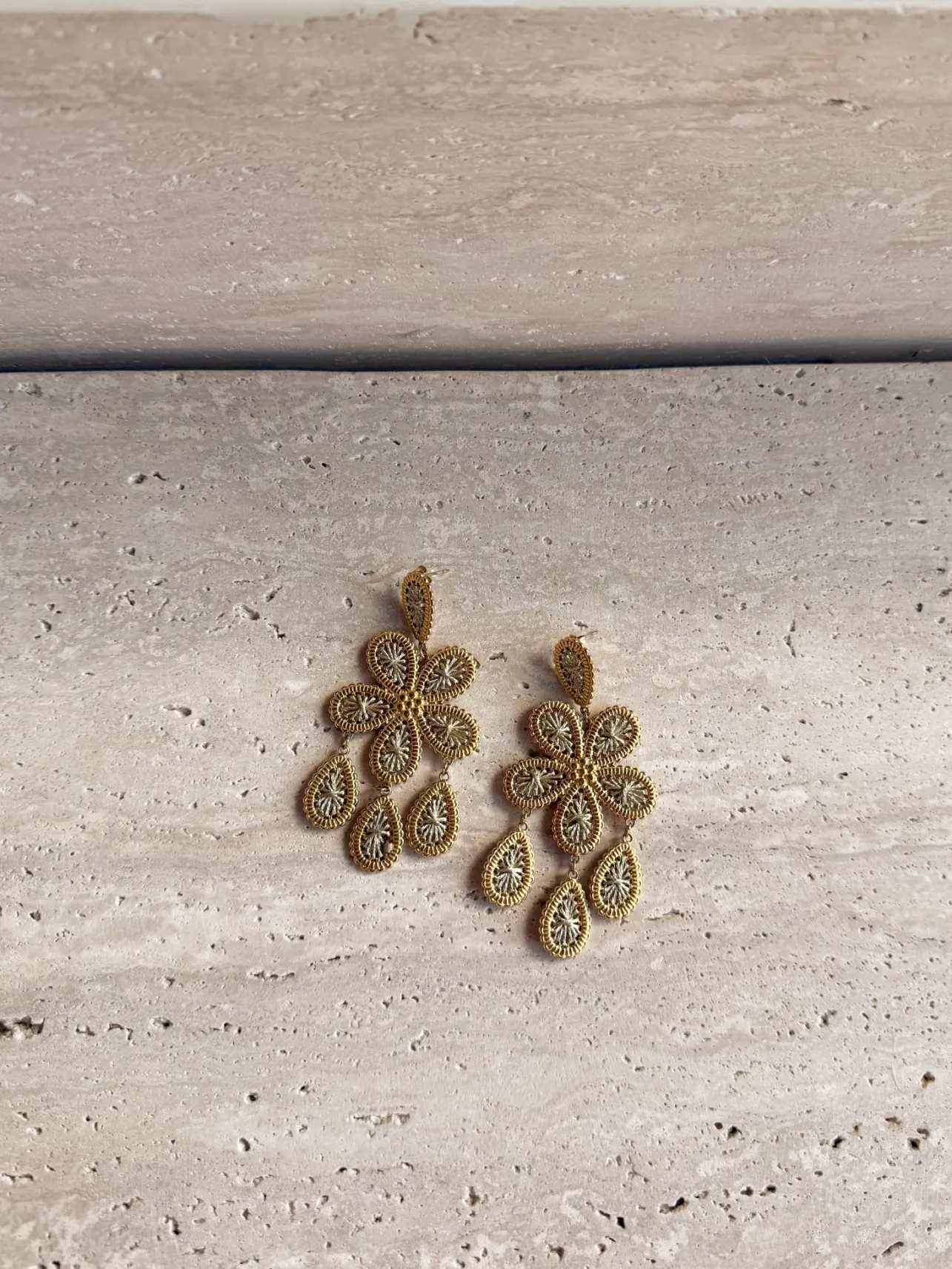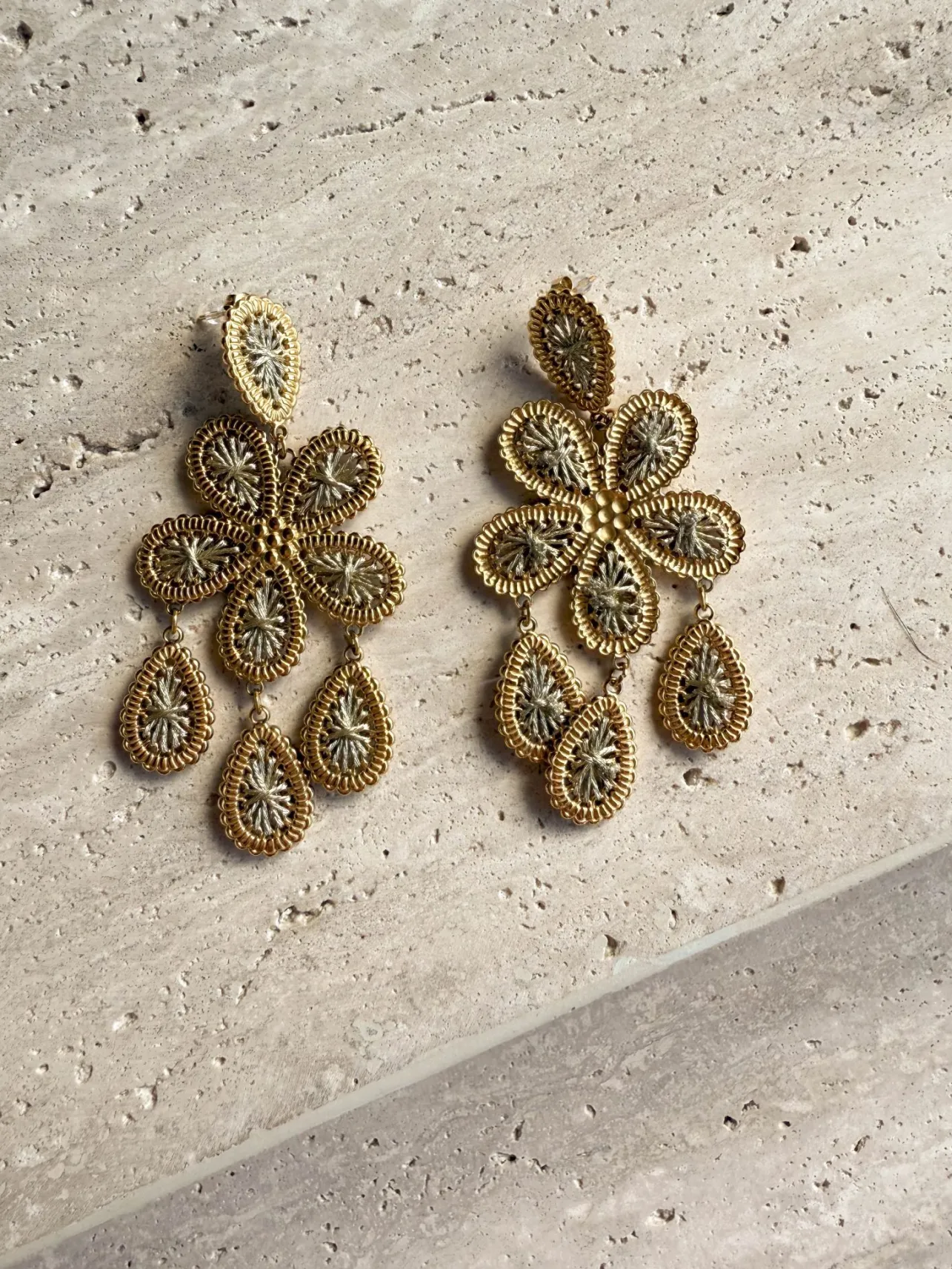 – Boucles d’oreilles pendantes– Pour oreilles percées– Forme fleur– Détail fil brodé ef…