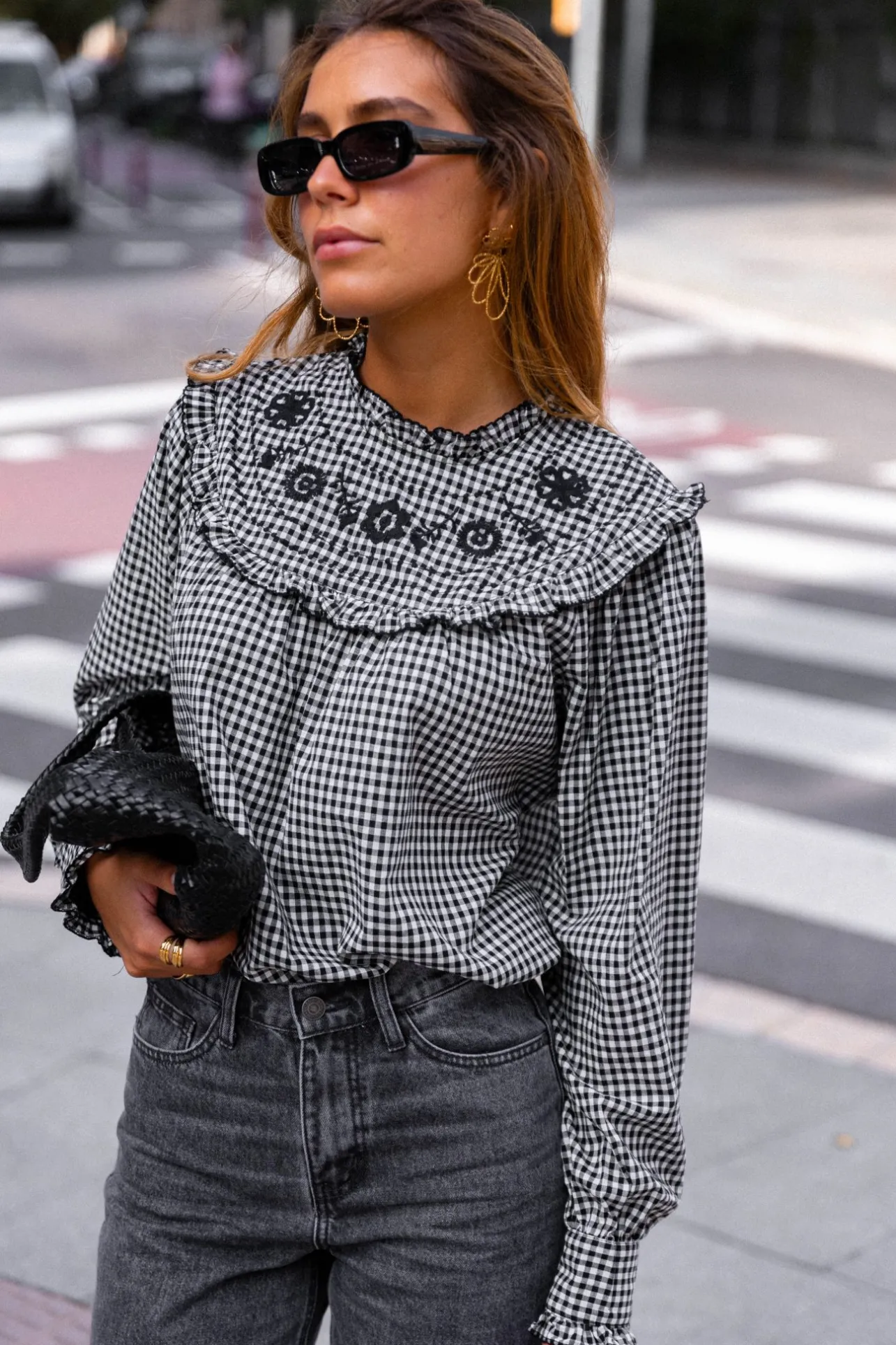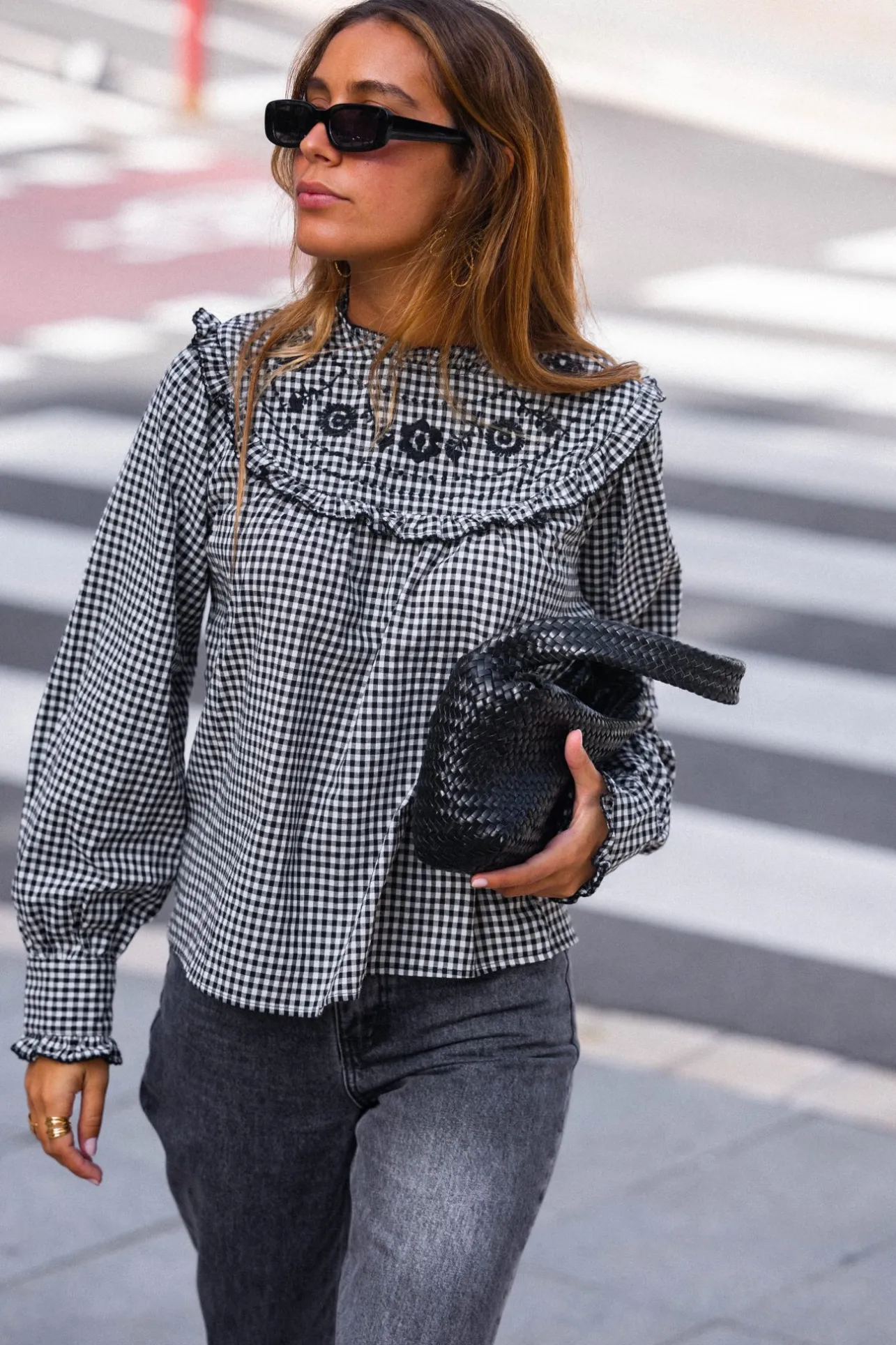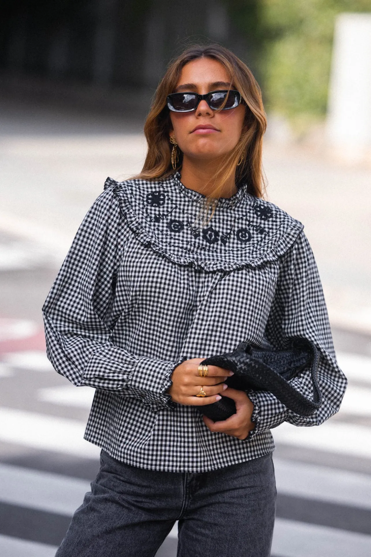 – Blouse fluide– Col montant avec volants– Fermeture par bouton au dos– Détail de broderies fle…