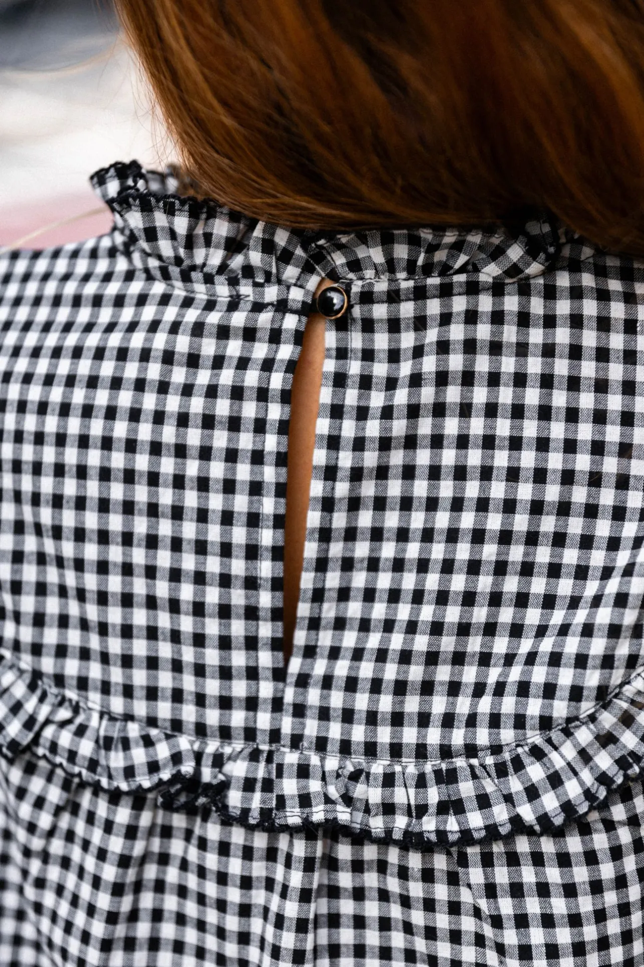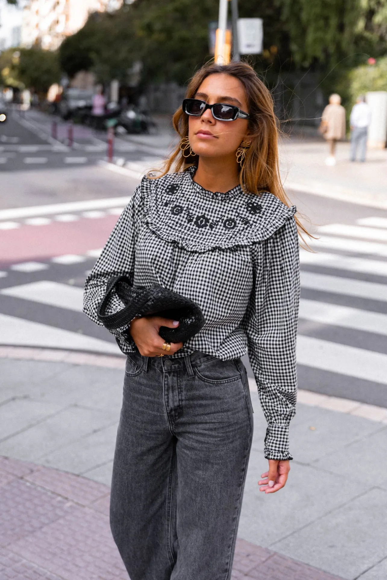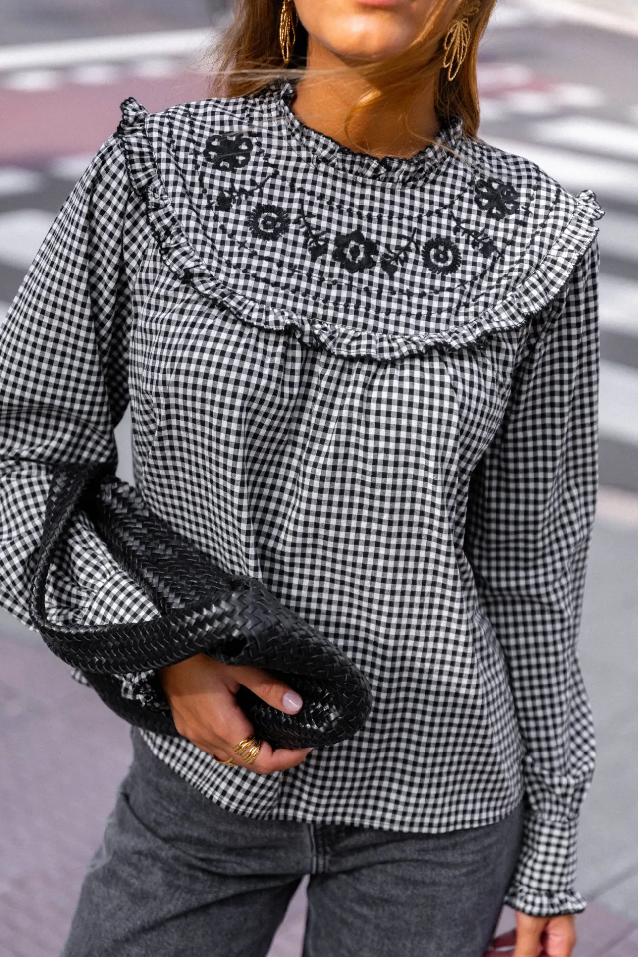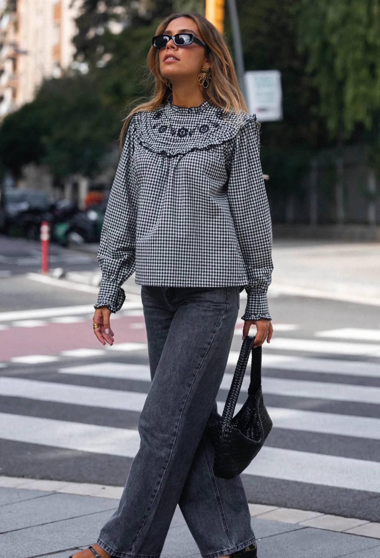 – Blouse fluide– Col montant avec volants– Fermeture par bouton au dos– Détail de broderies fle…
