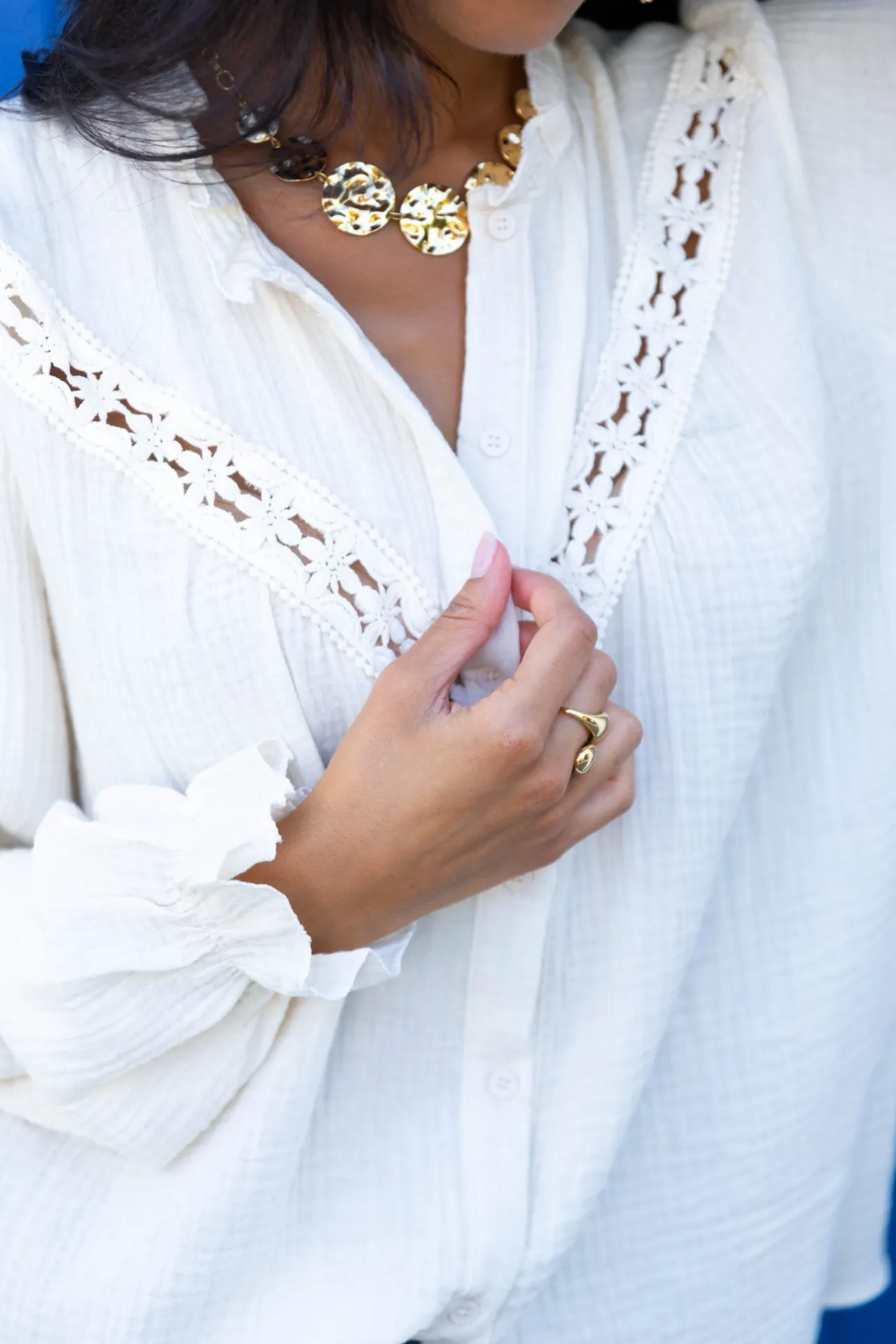 – Col montant– Manches longues– Fermeture par boutons sur l’avant– Broderies et gaze de co…