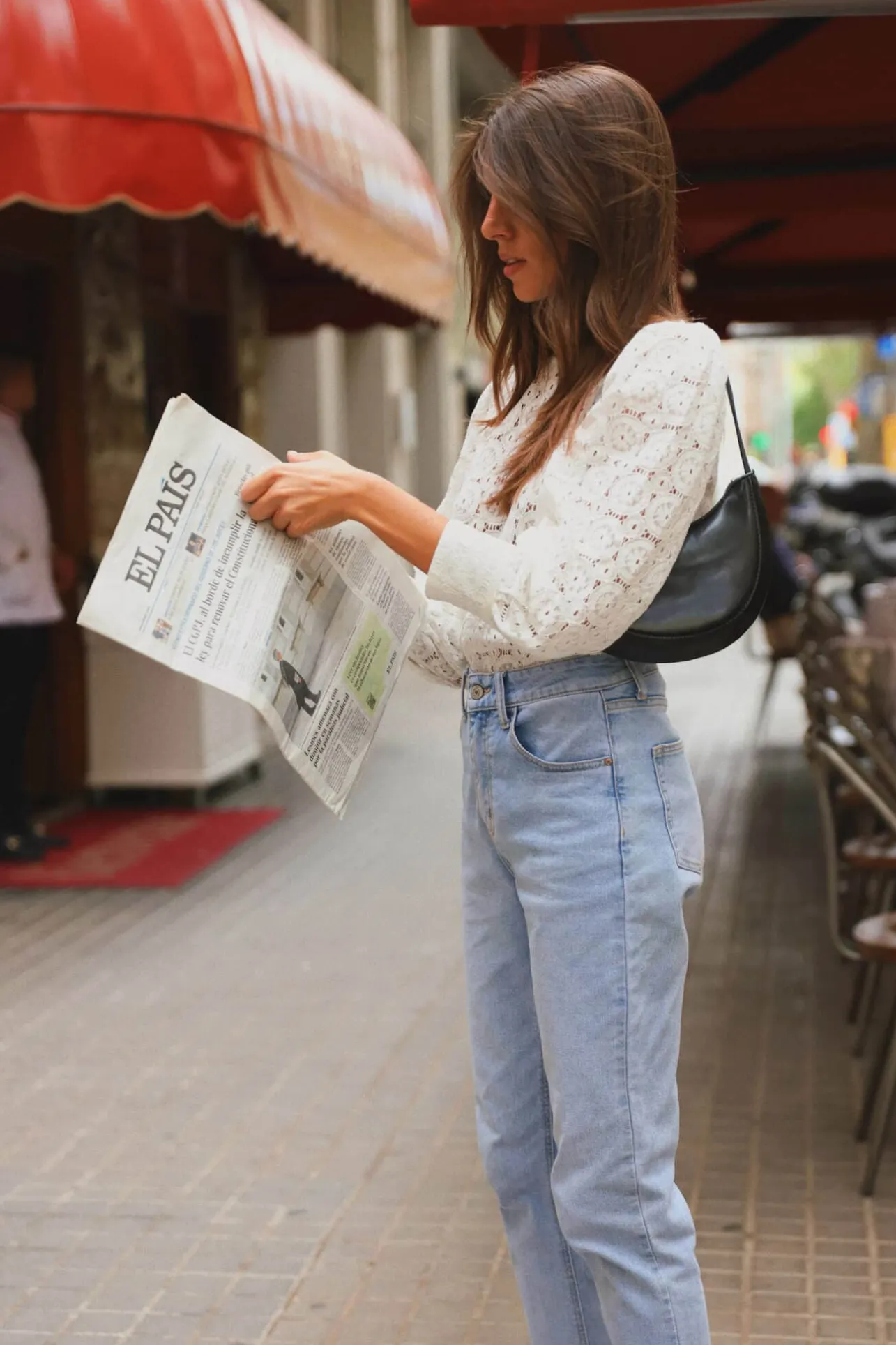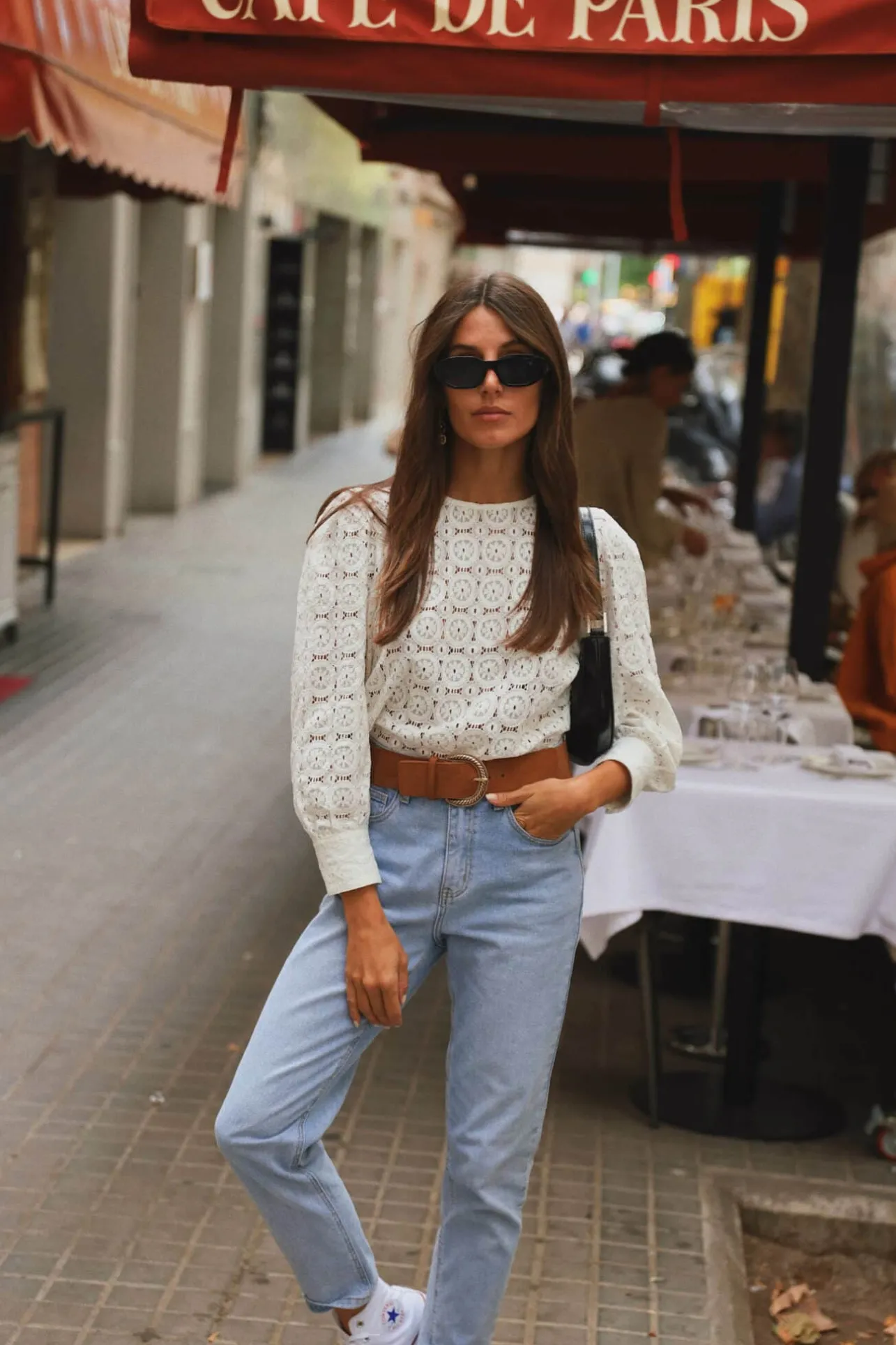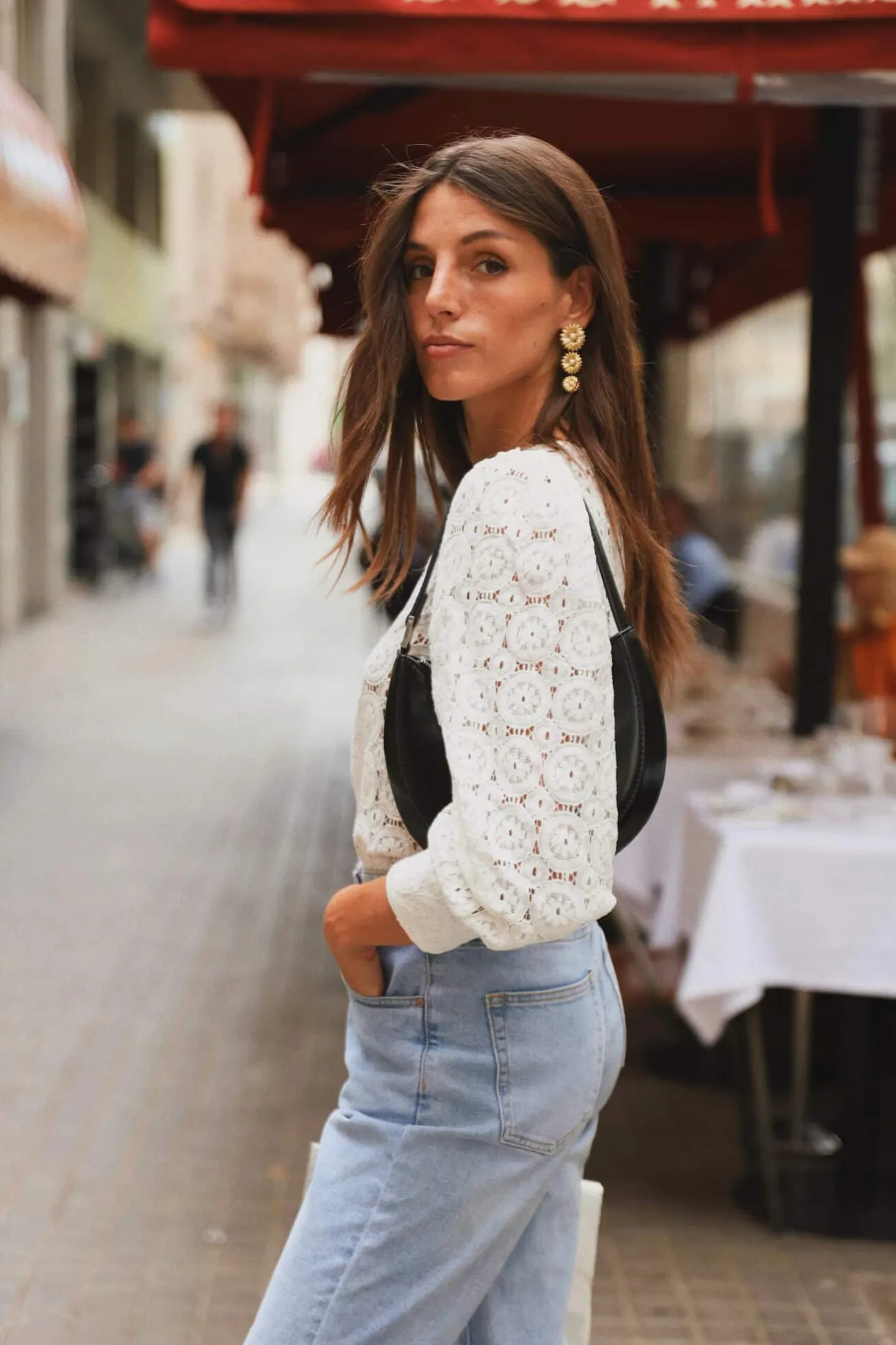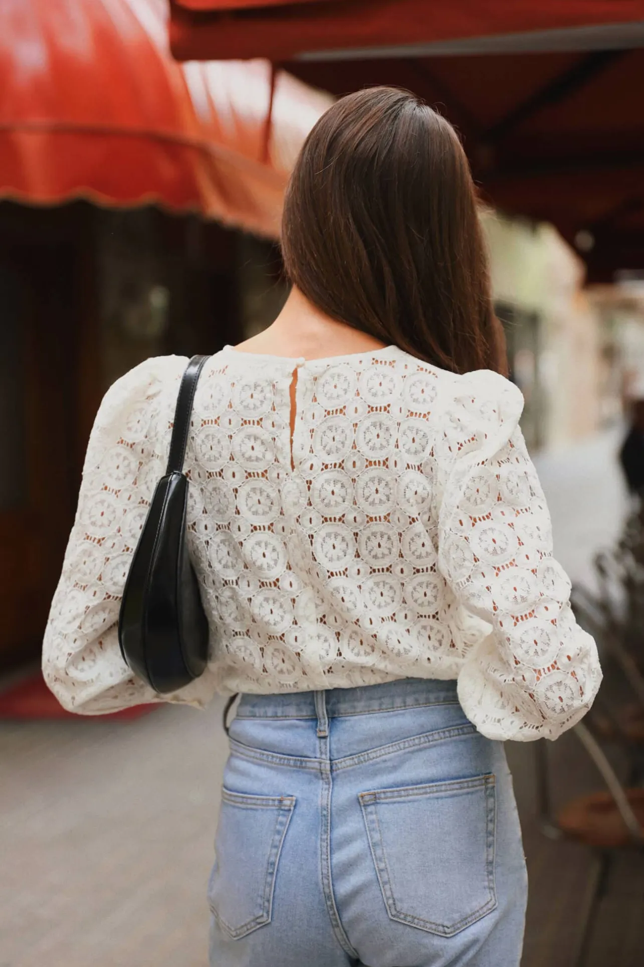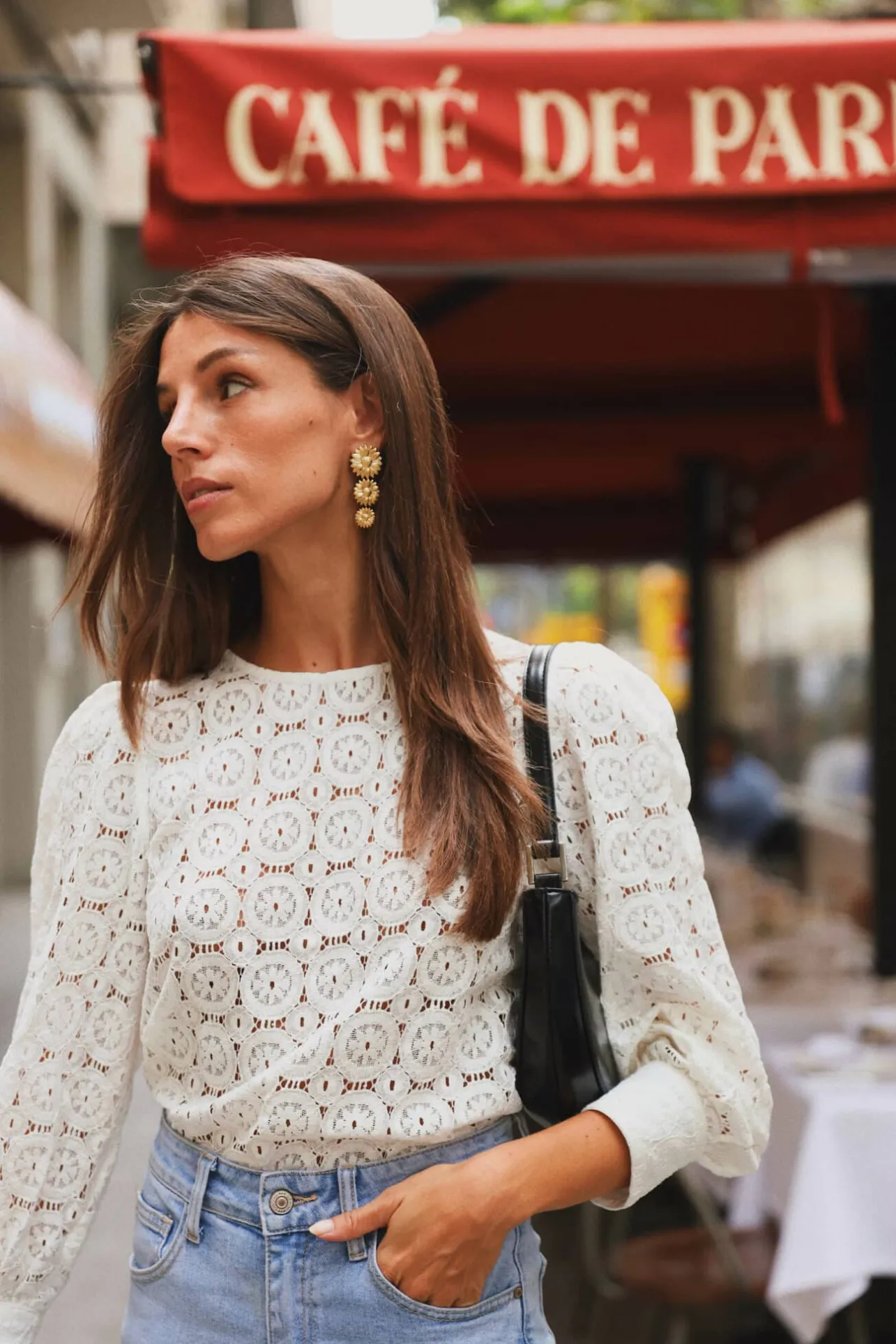 – Blouse en dentelle– Bouton blanc et doré au dos– Manches longues– Fermeture par boutons aux p…