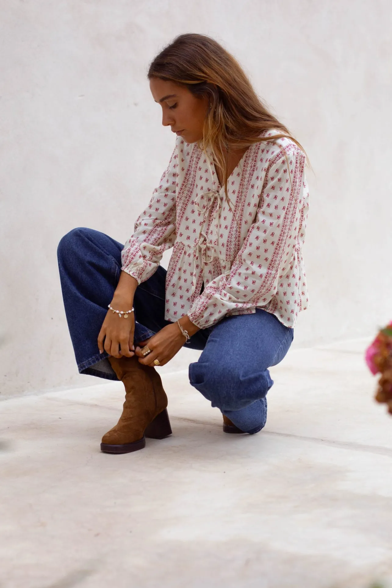 – Blouse manches longues– Fermeture à l’avant– Imprimé fleuri rouge– Couleur : écruLe mannequin mesure …