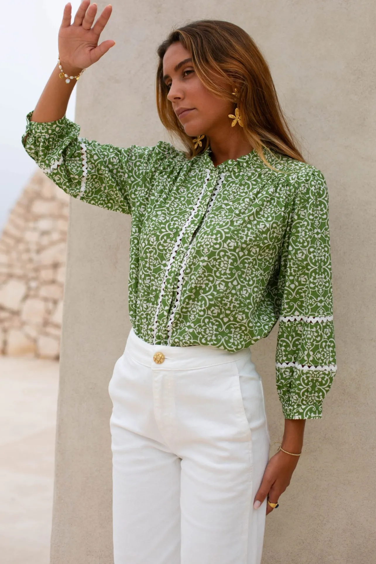 – Chemise col haut– Manches longues resserrées aux poignets– Fermeture par boutons à l’avant&#…