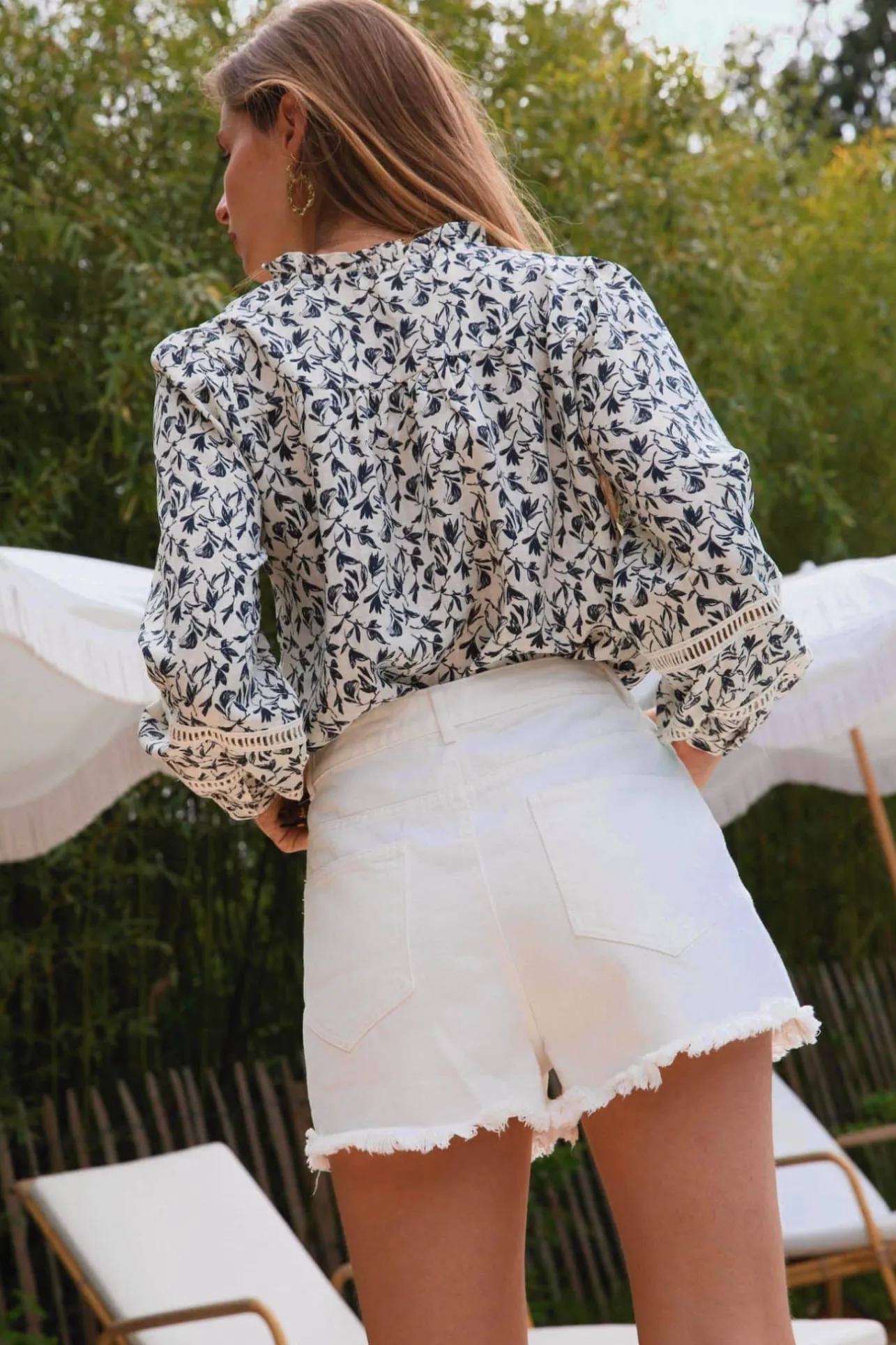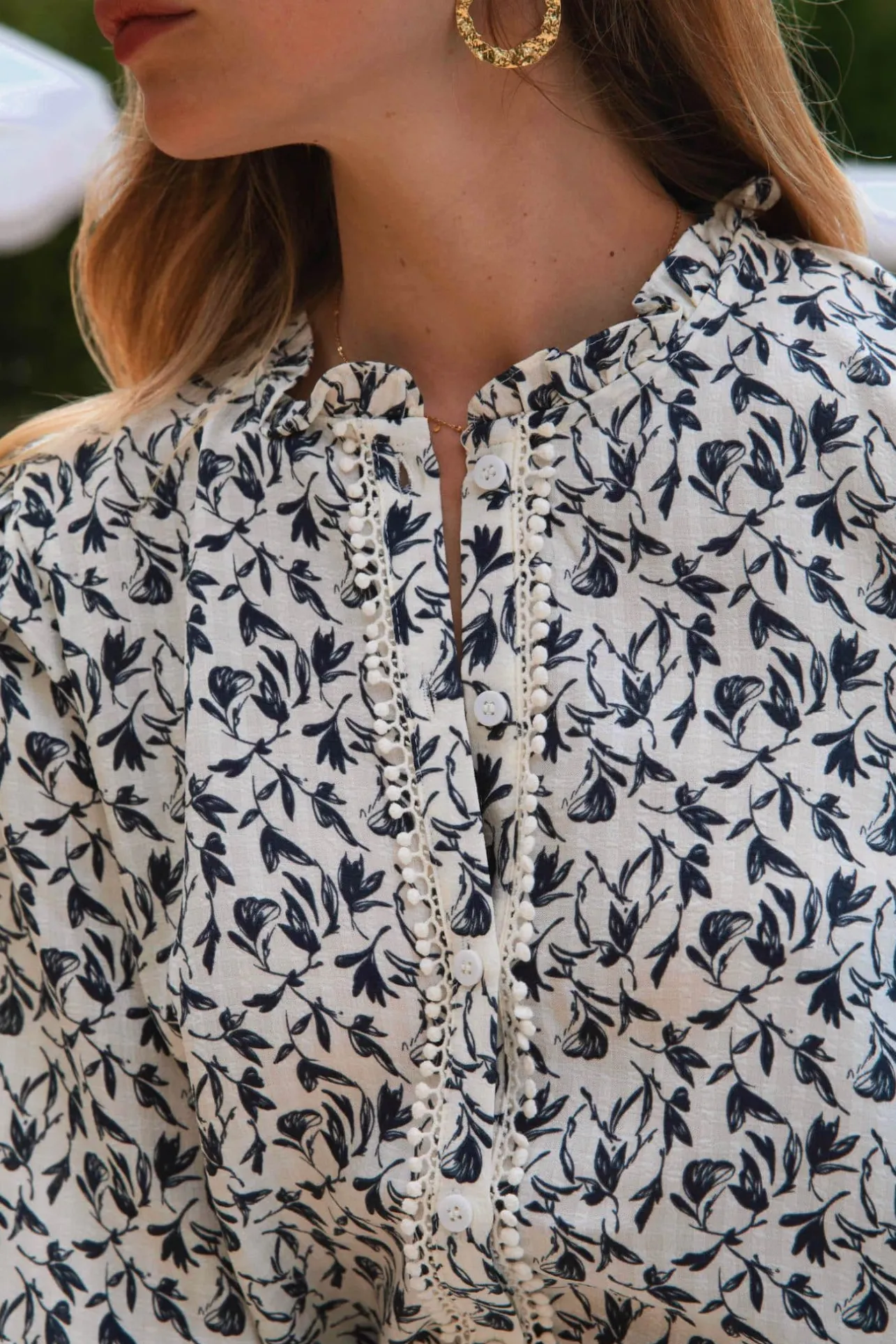 – Blouse fluide– Col montant avec volants– Manches longues avec détails dentelle ajourée– Ferm…
