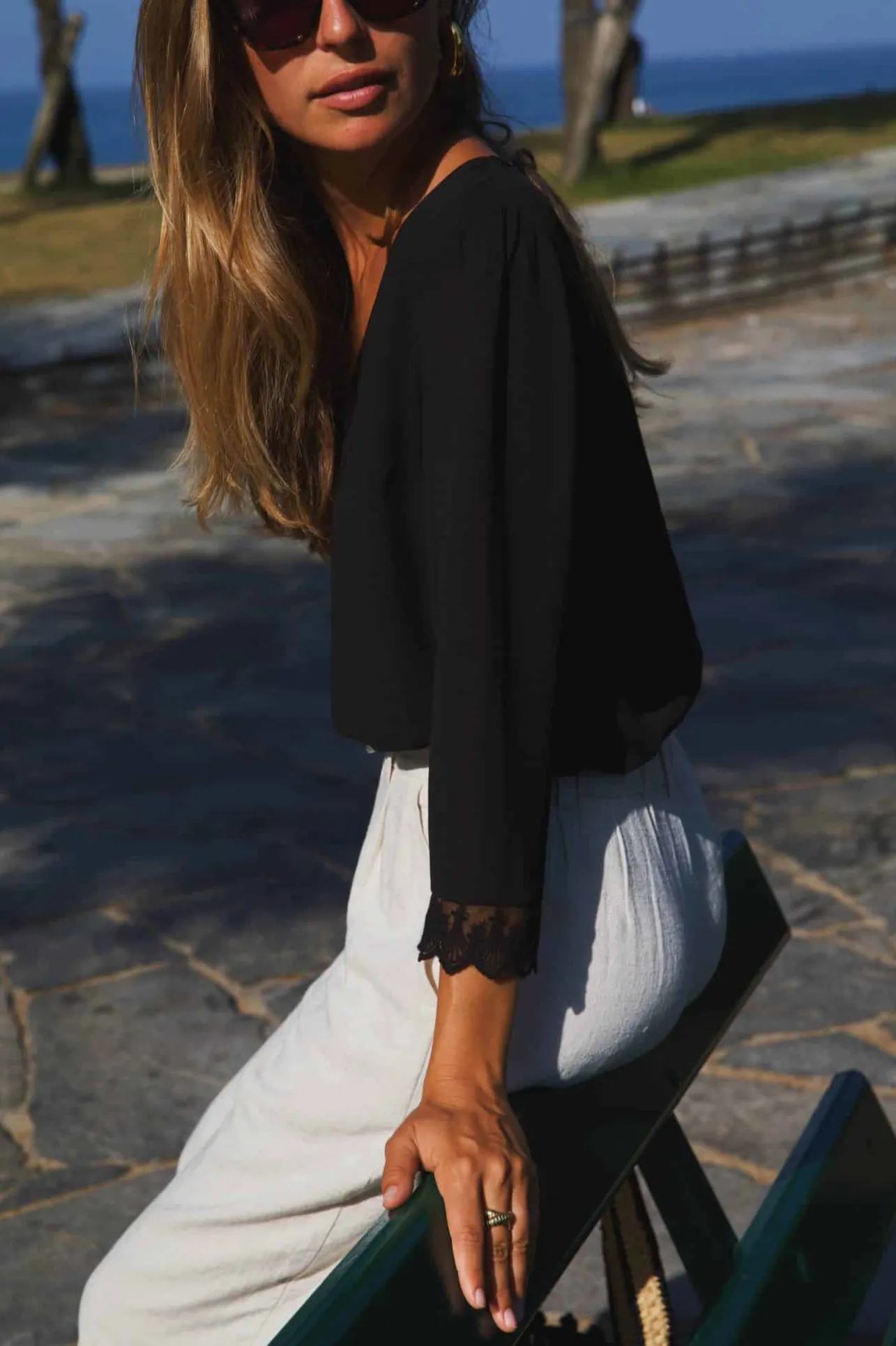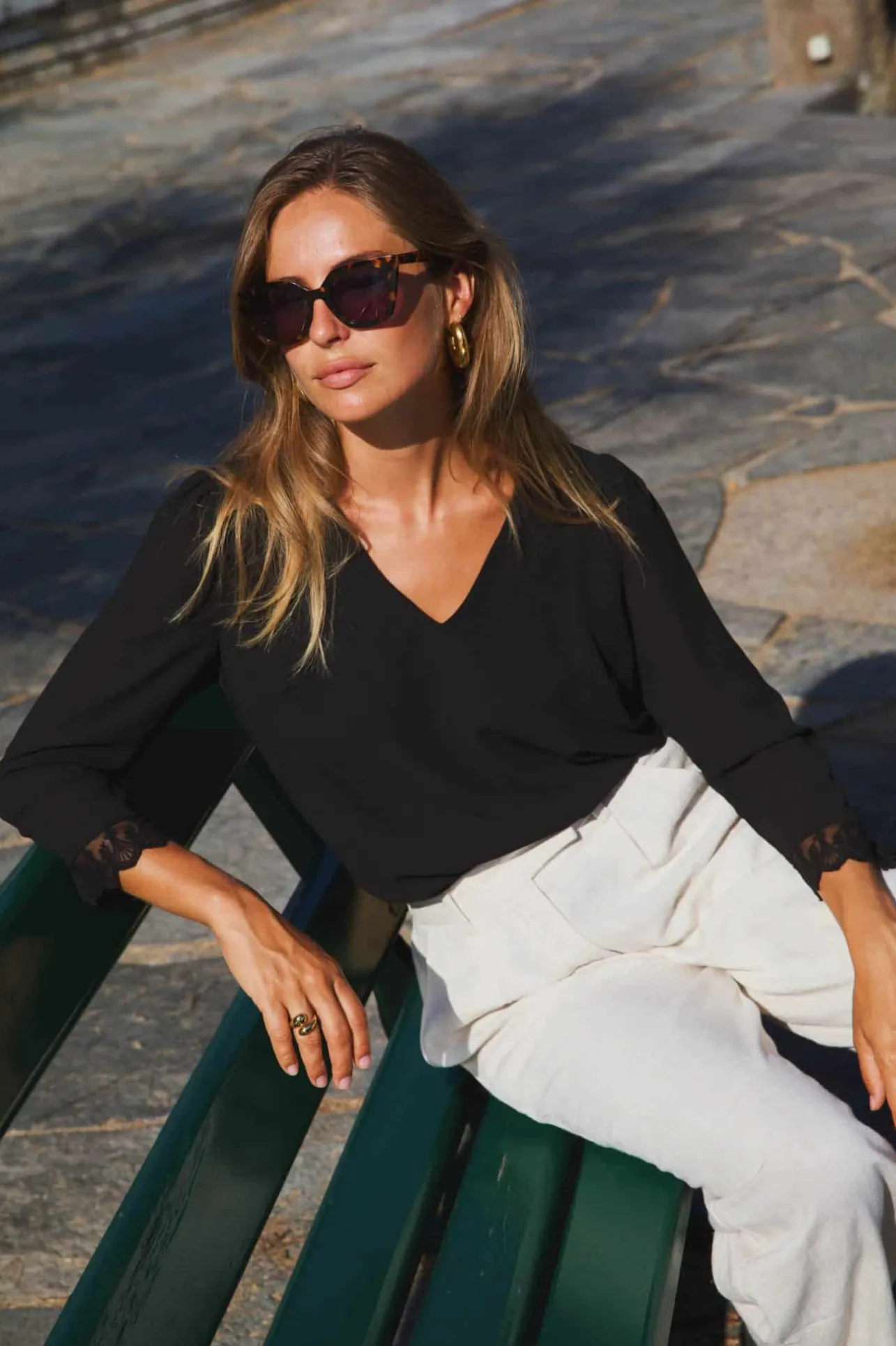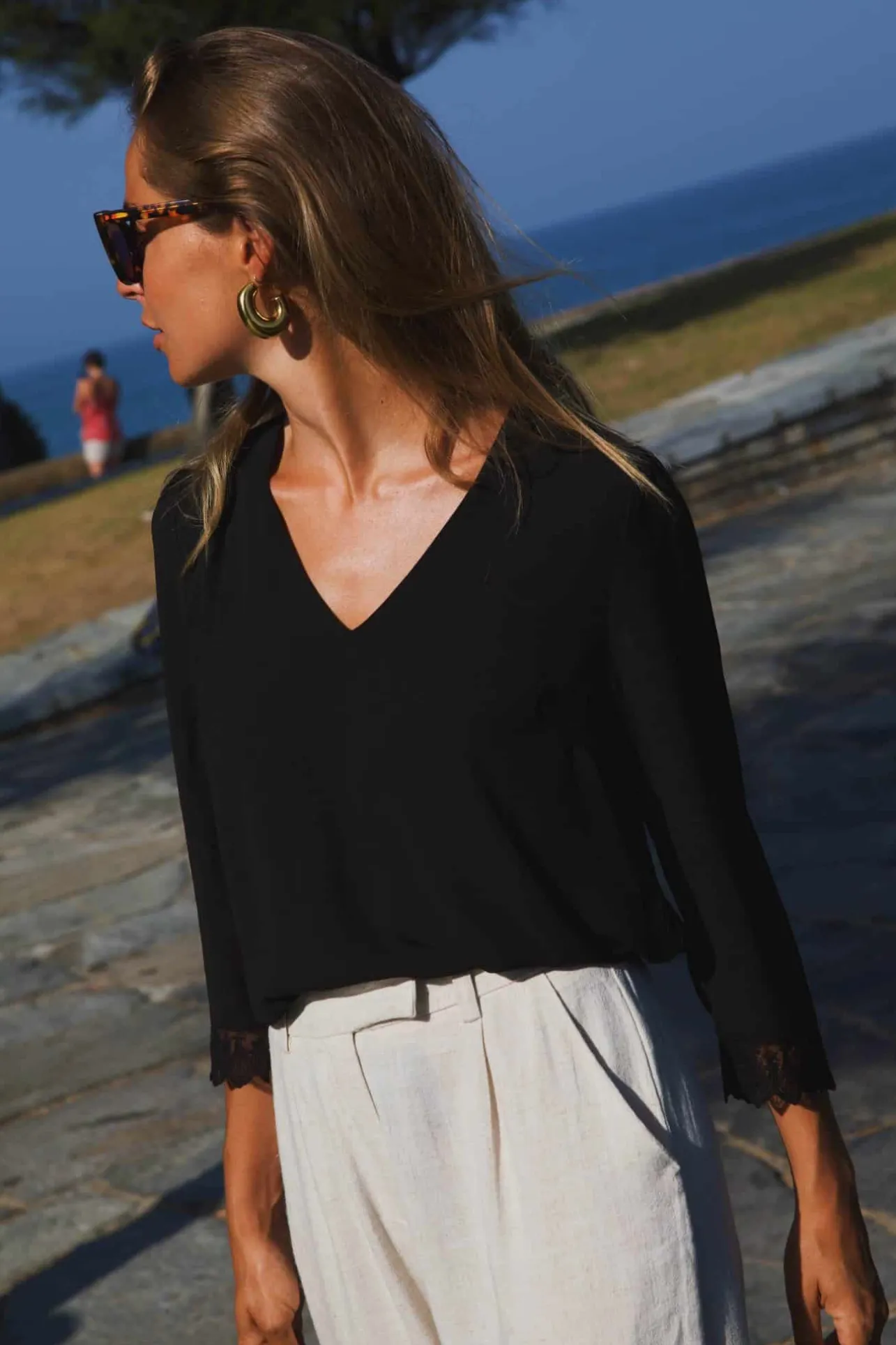 – Blouse col V– Dentelle sur le bout des manches– Dentelle au dos– Doublée sur l’avant…