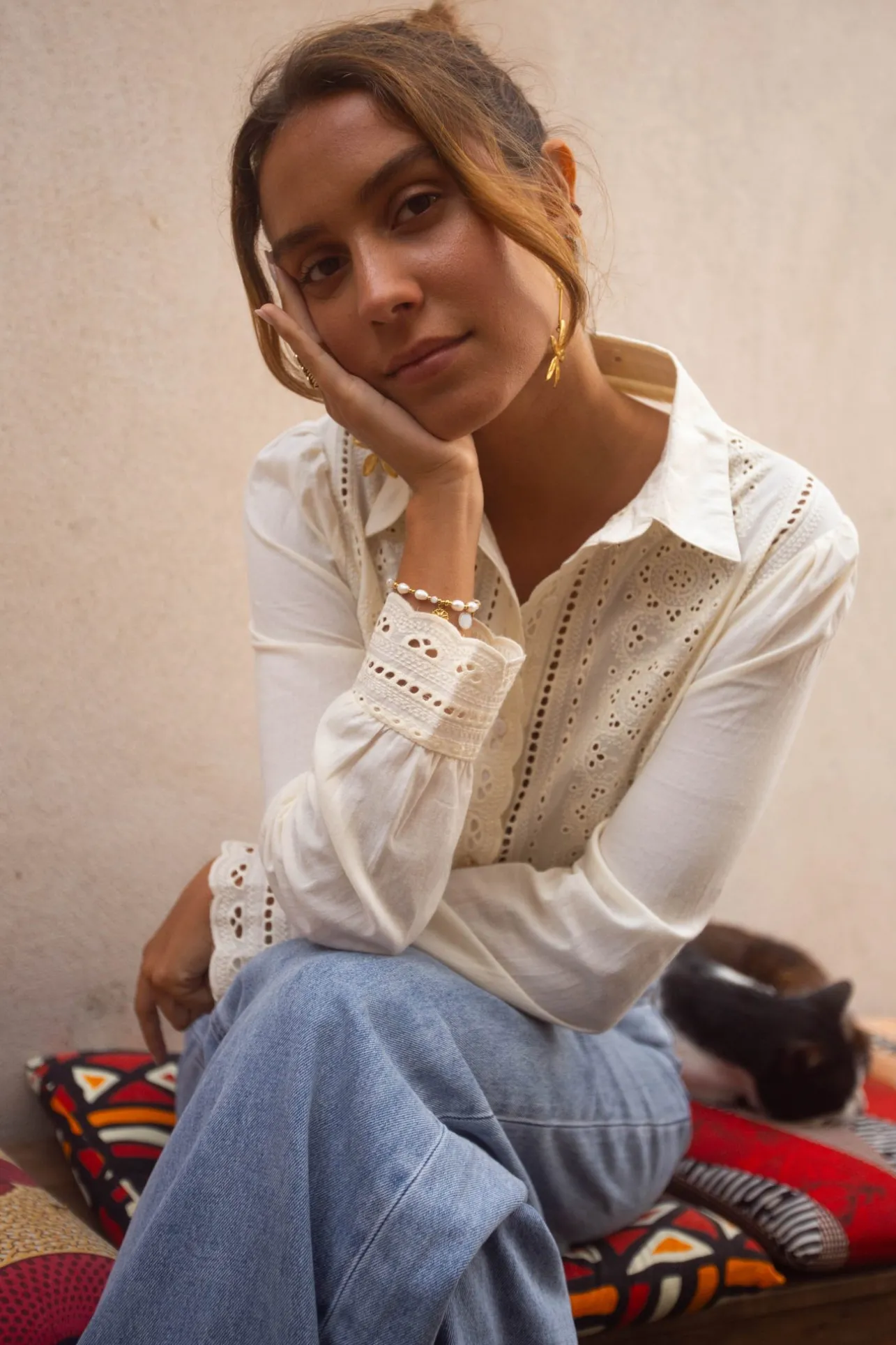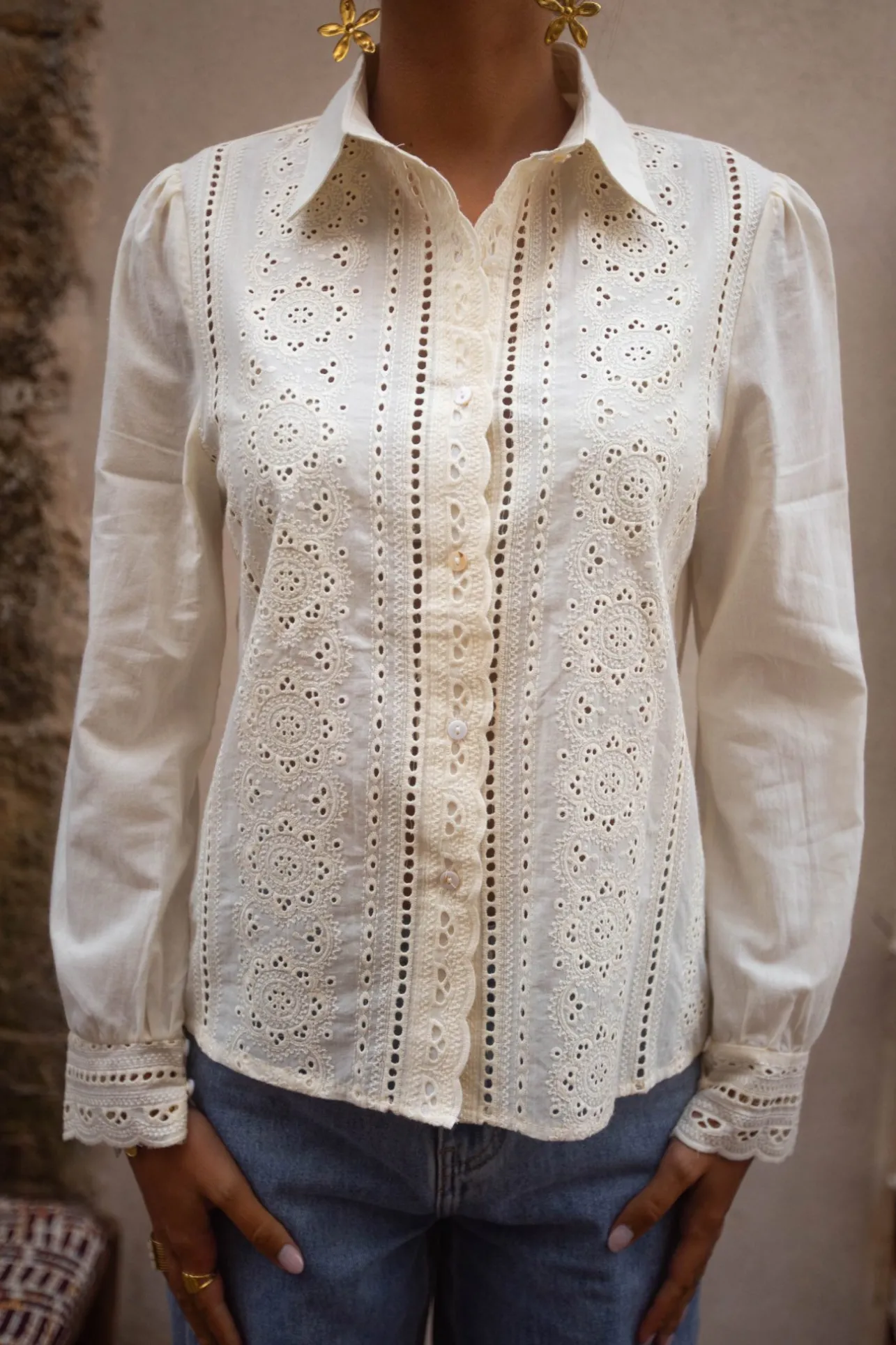 – Col chemise– Manches longues– Broderie sur les manchettes– Fermeture par boutons– Broder…