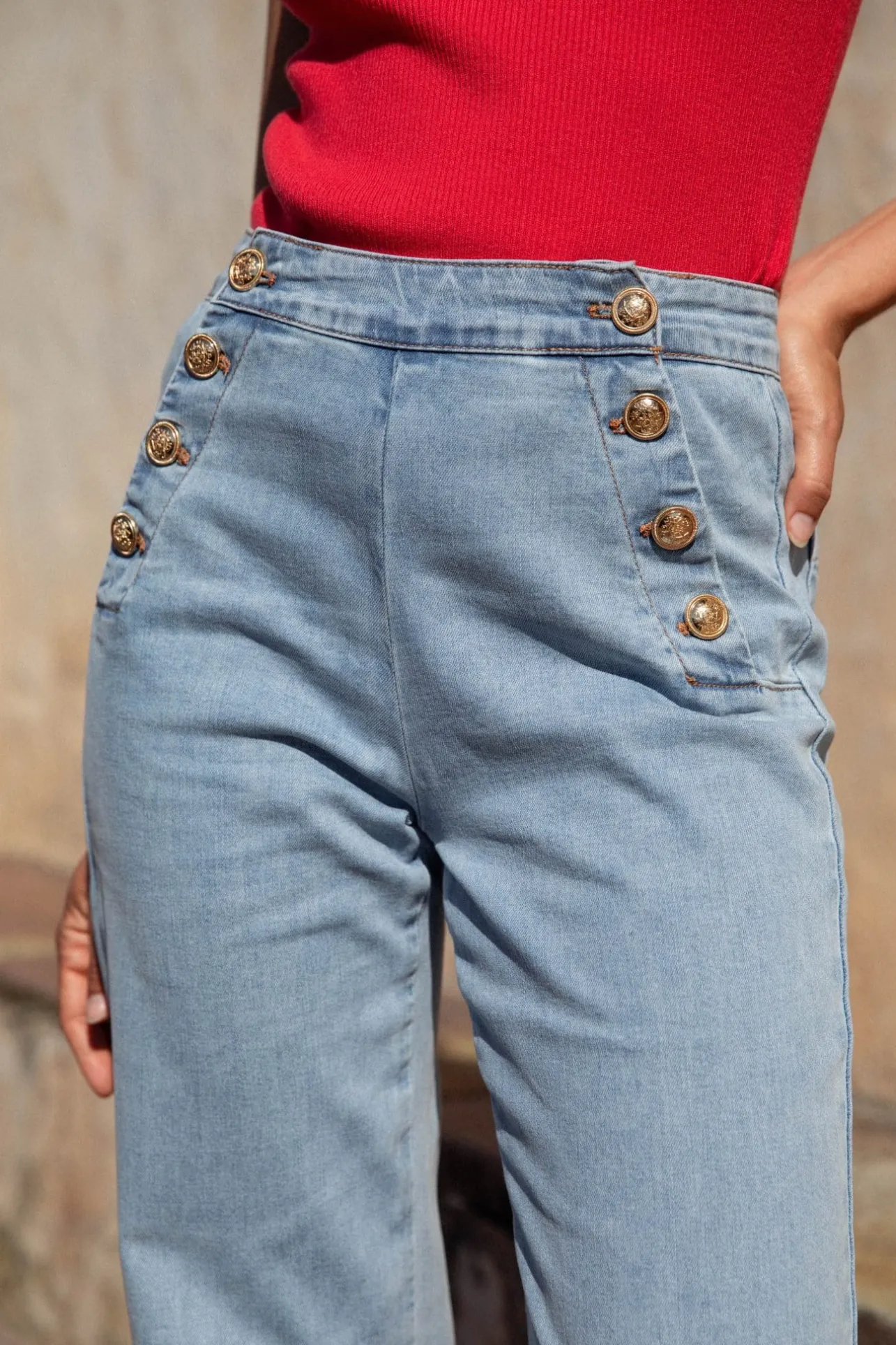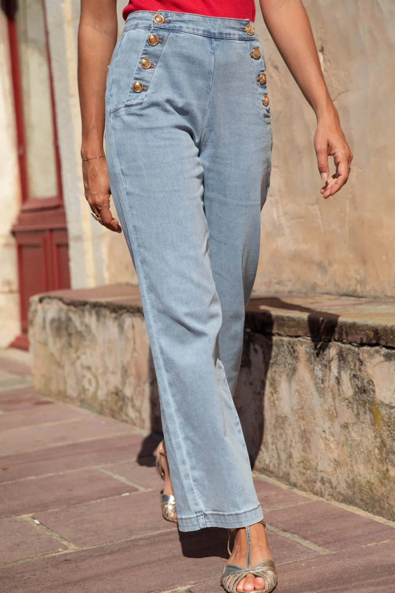 – Jeans taille haute– Deux poches arrière– Fermeture par boutons sur le devant– Couleur : bleuL…