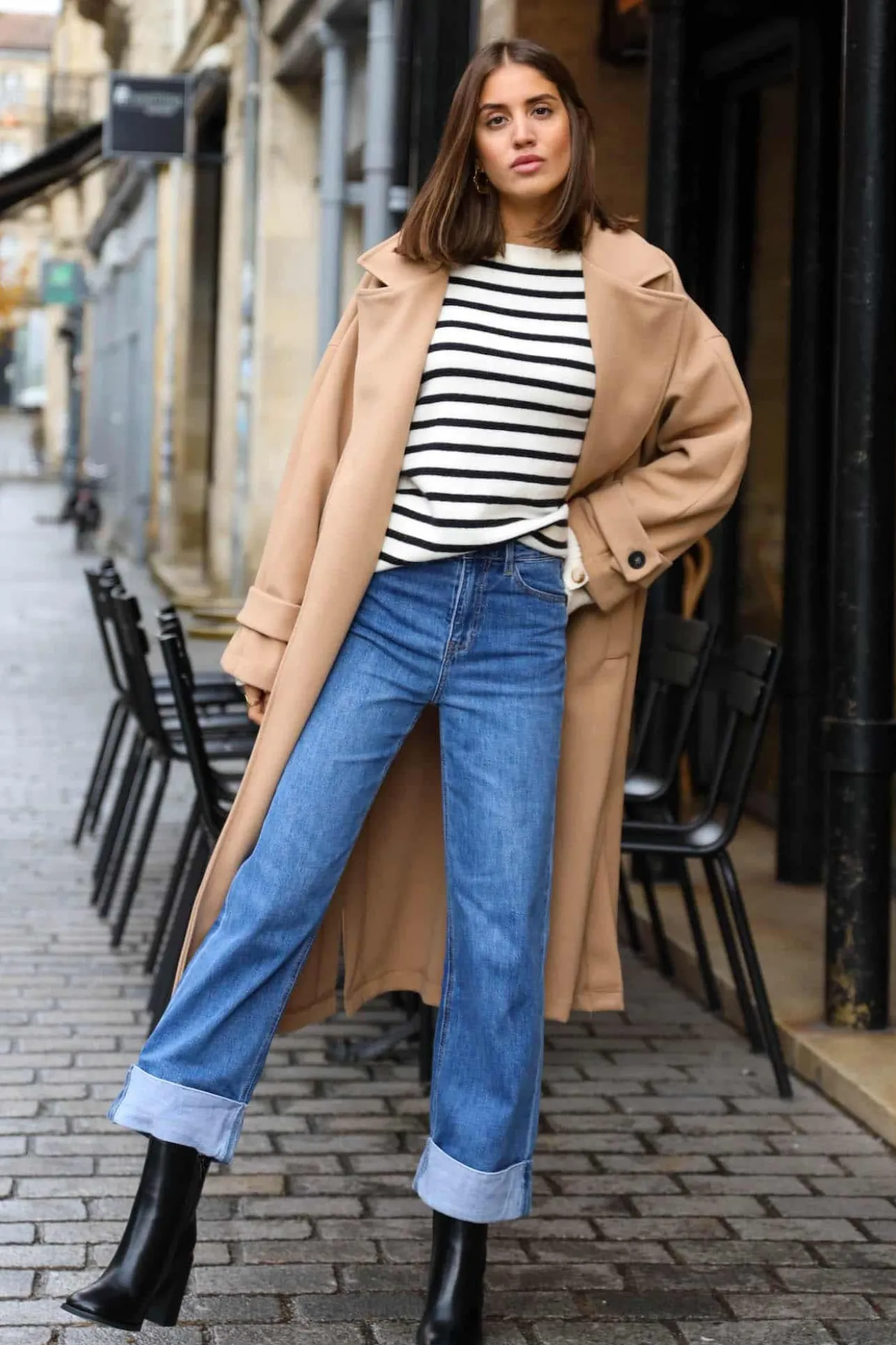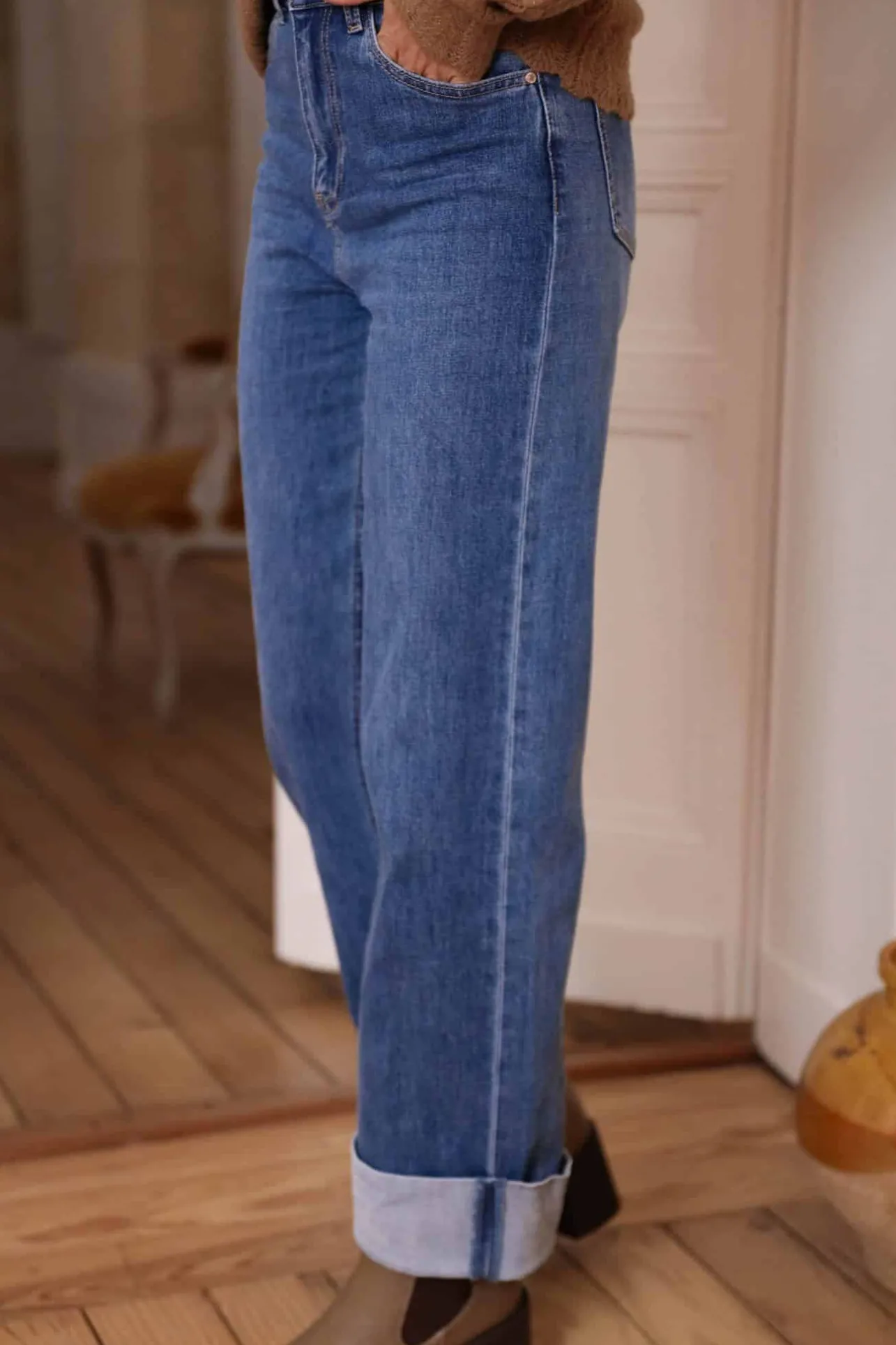 – Jean taille haute– Coupe droite– Ourlets cousus– Deux poches à l’avant– Deux poch…