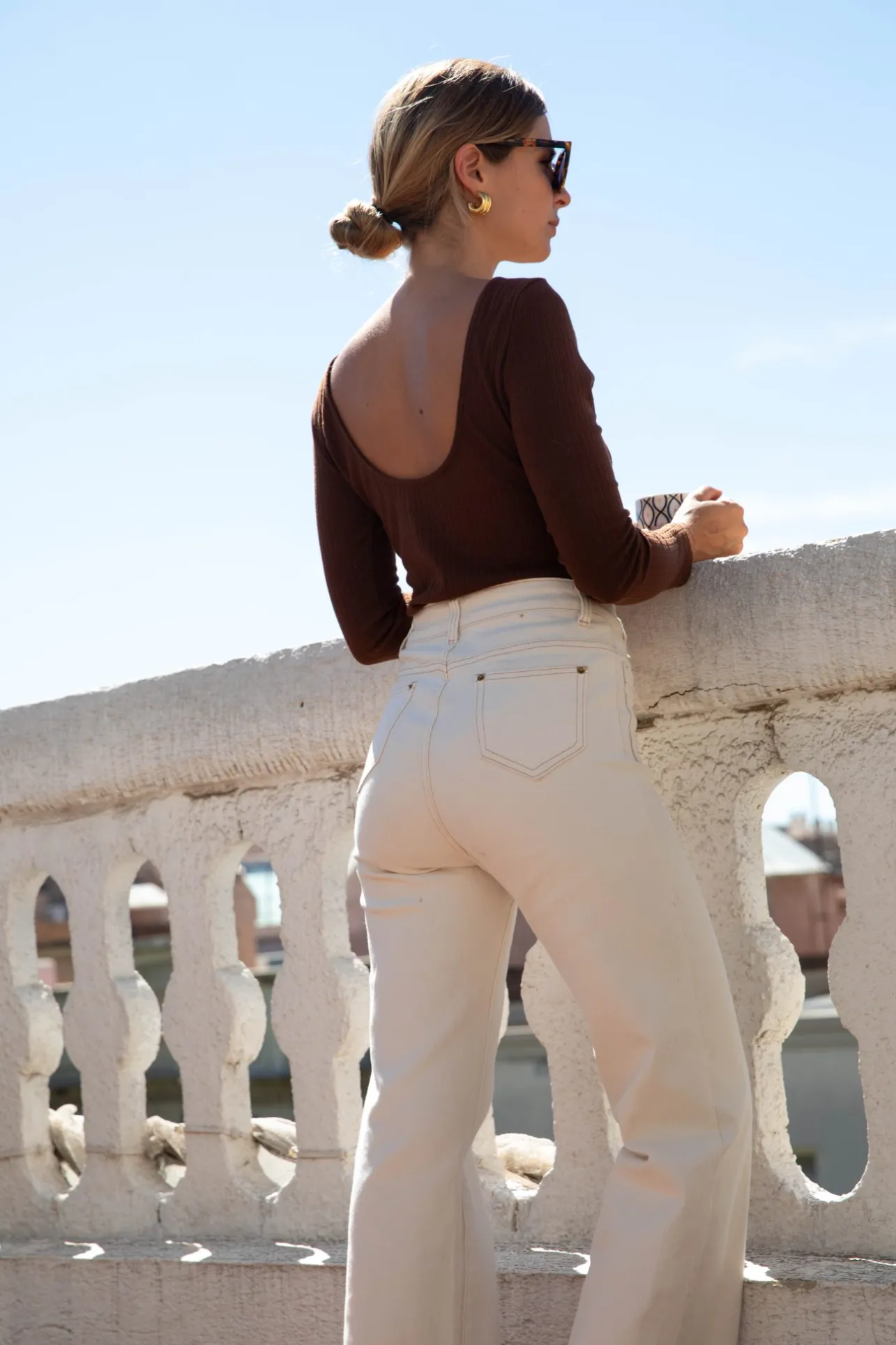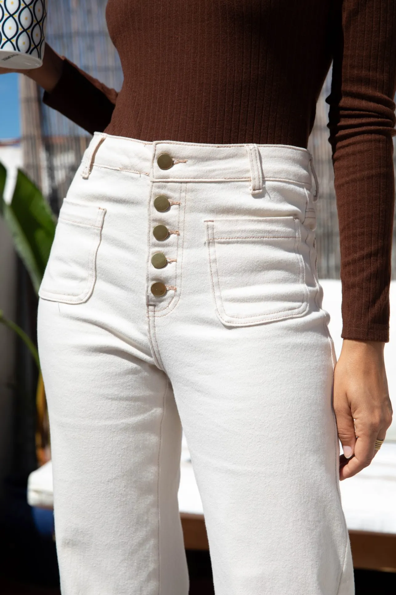 – Jean taille haute– Légèrement évasé sur le bas– Fermeture par boutons– Deux poches avant&#…