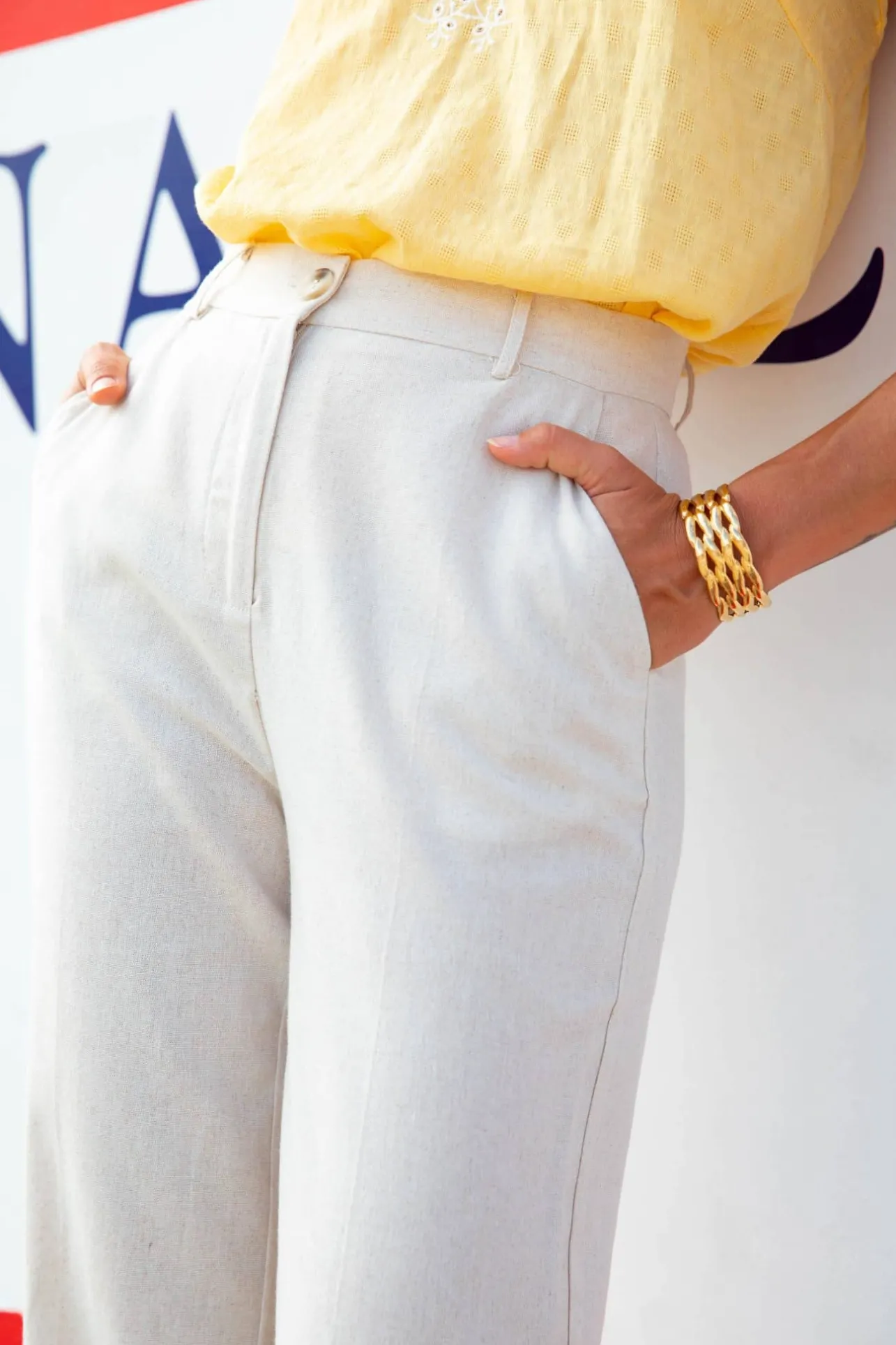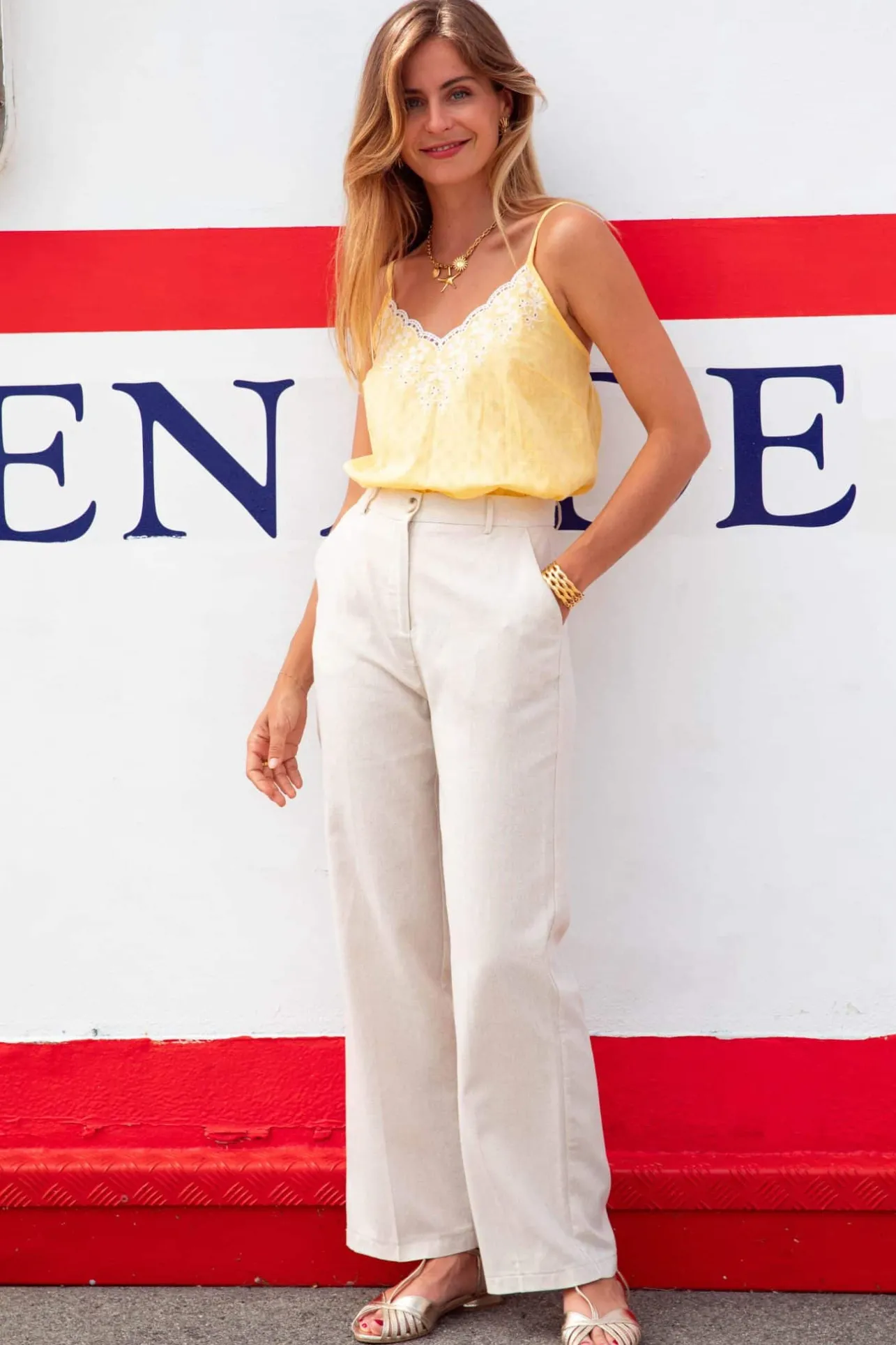 – Pantalon taille haute– Coupe droite– Deux poches sur les côtés– Couleur : beigeLe mannequin …