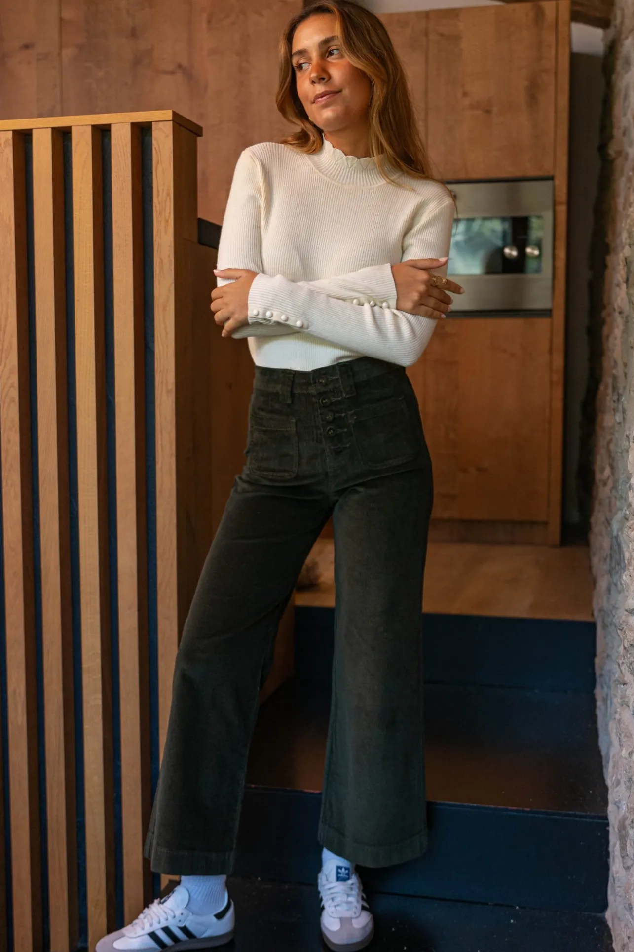 – Pantalon velours côtelé– Taille haute– Fermeture par boutons– Deux poches avant– Deux …