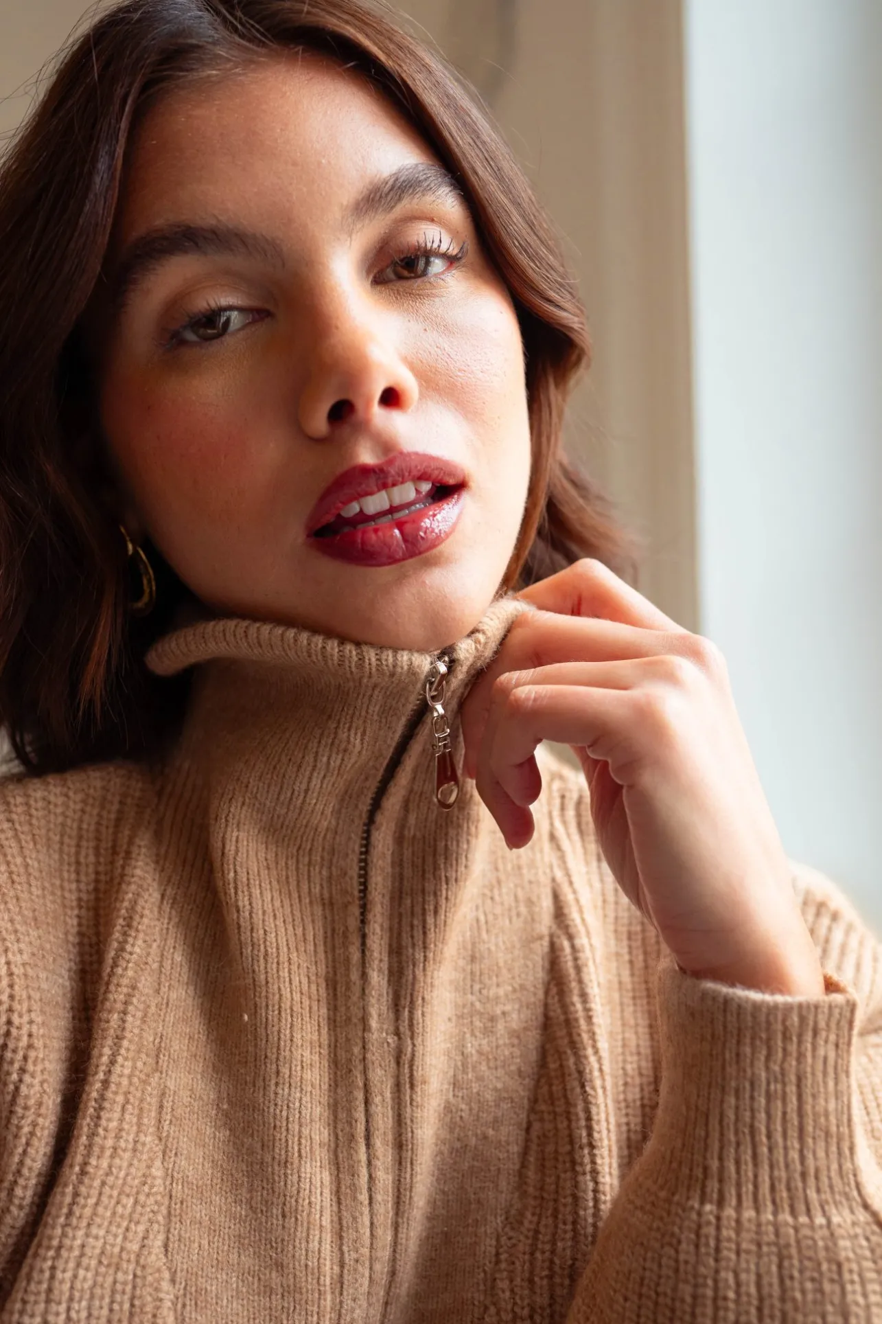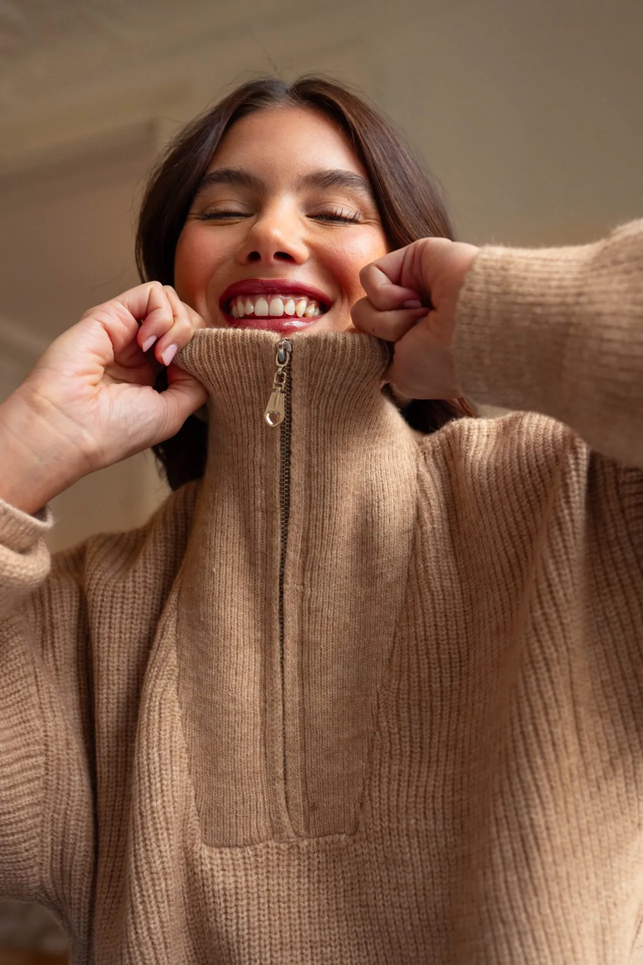 – Col camionneur– Pull tout doux– Fermeture zip sur le haut– Manches longues resserrées aux poi…