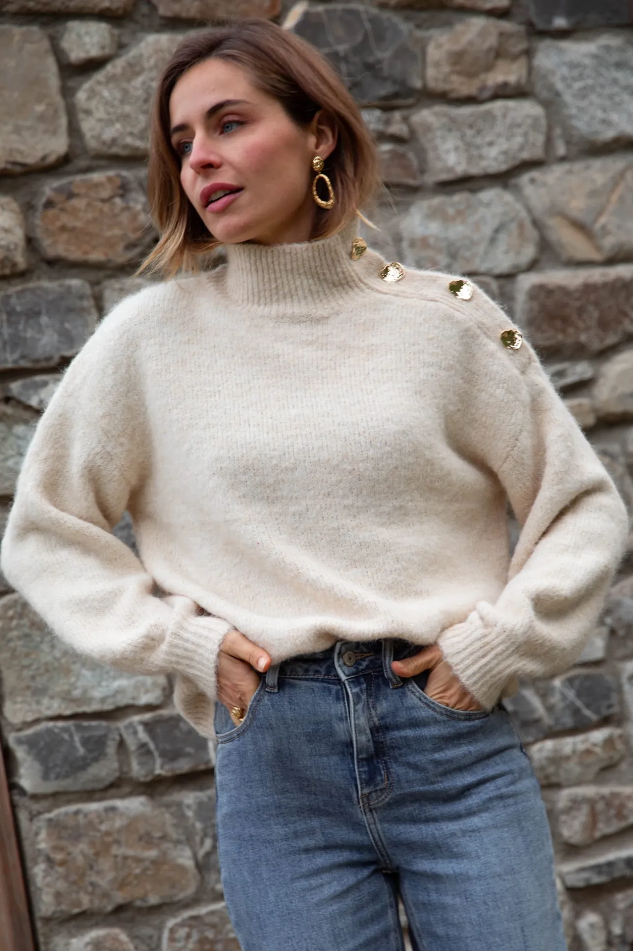 – Fermeture par boutons dorés en forme de pétale sur l’épaule
