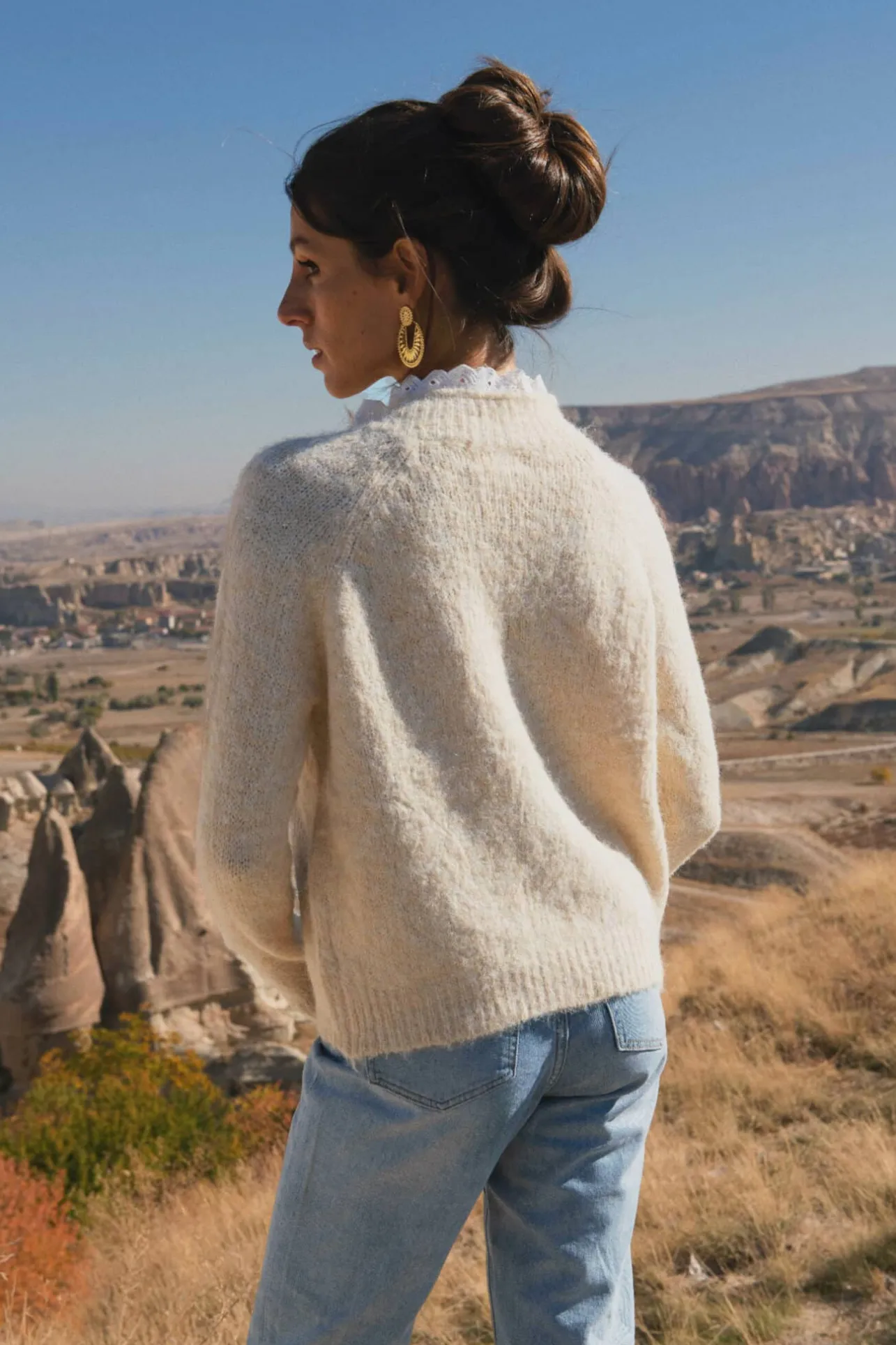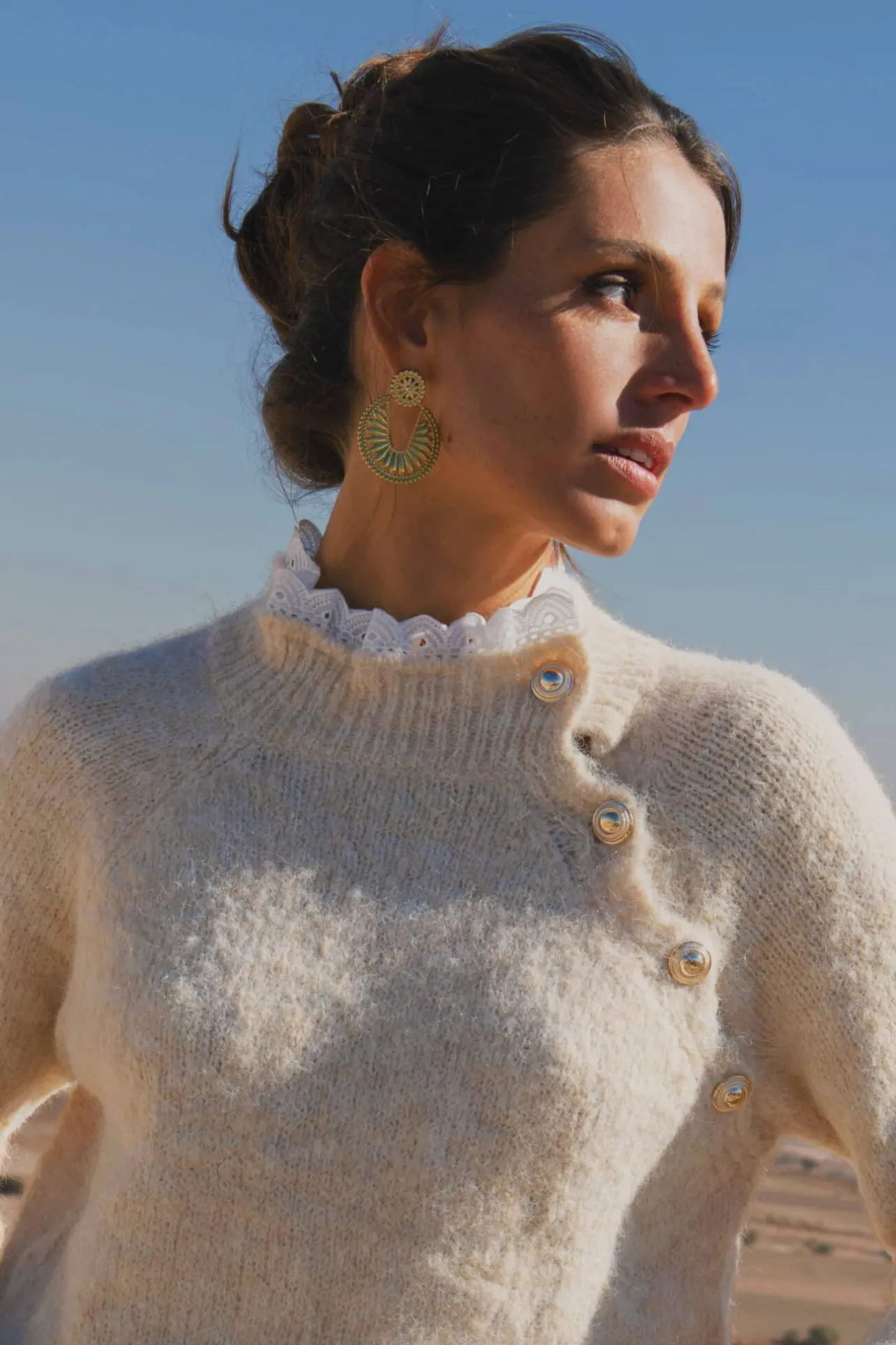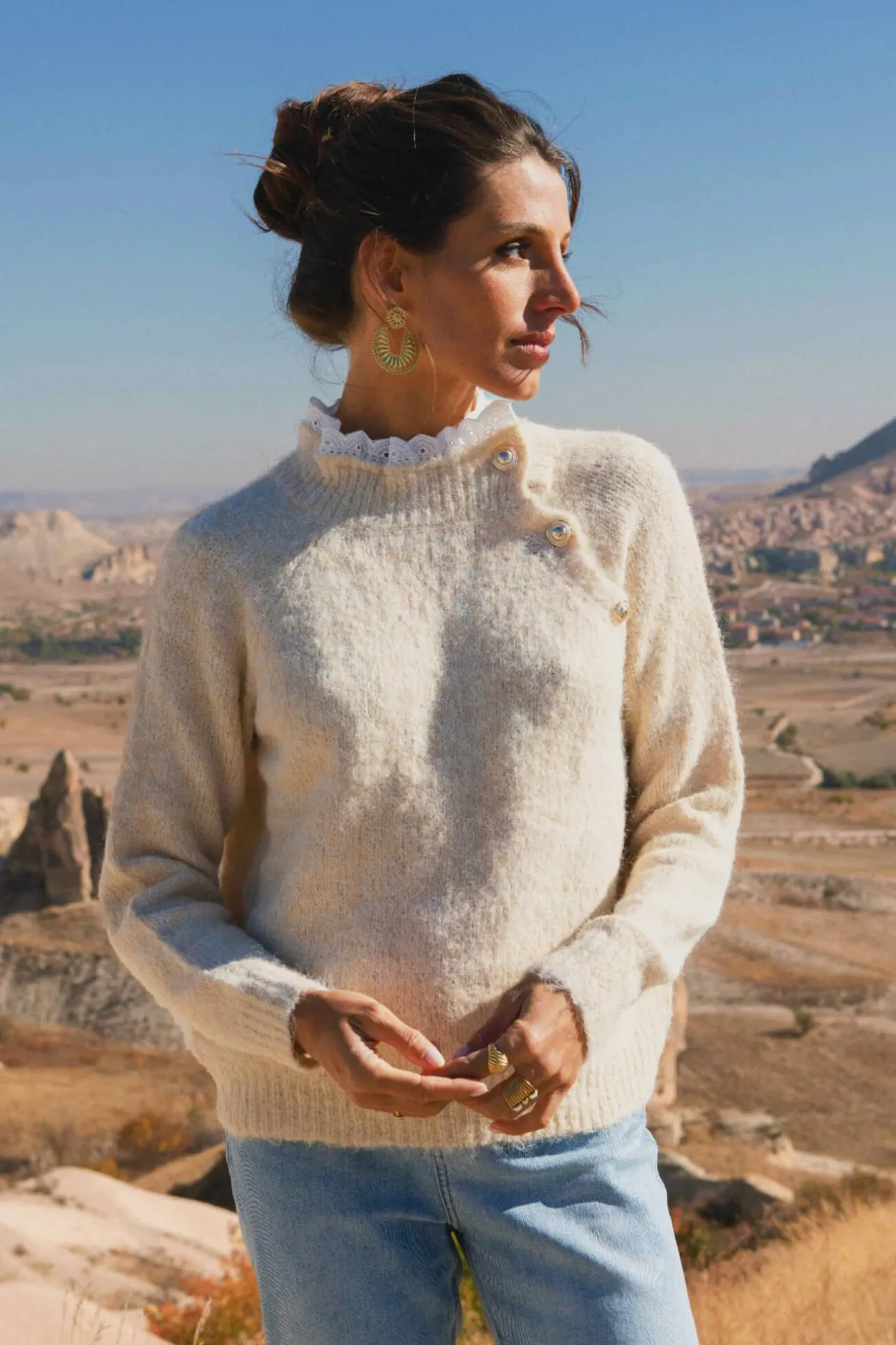 – Pull tout doux– Col montant avec dentelle– Fermeture par boutons dorés sur l’épaule– C…