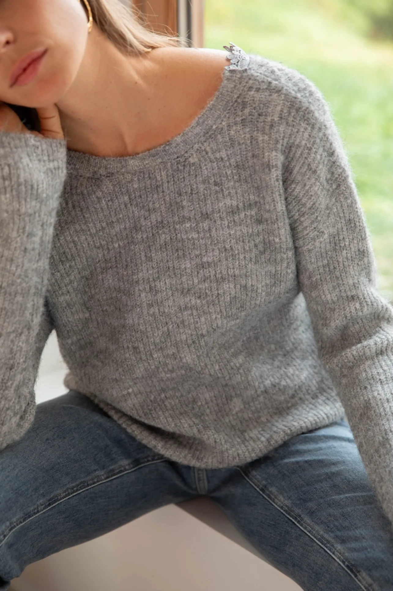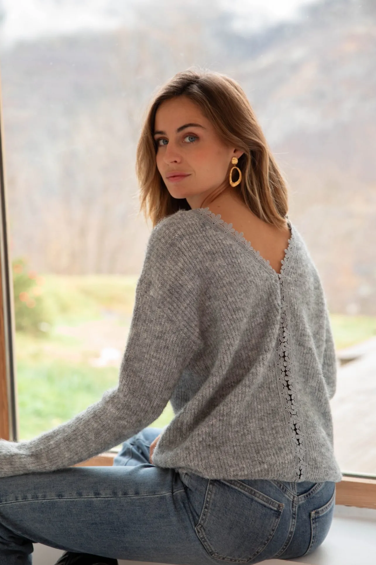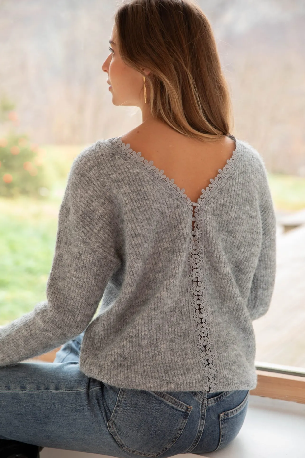 – Pull tout doux– Dos nu– Col rond– Détail de liseré en dentelle au dos– Couleur : gris …
