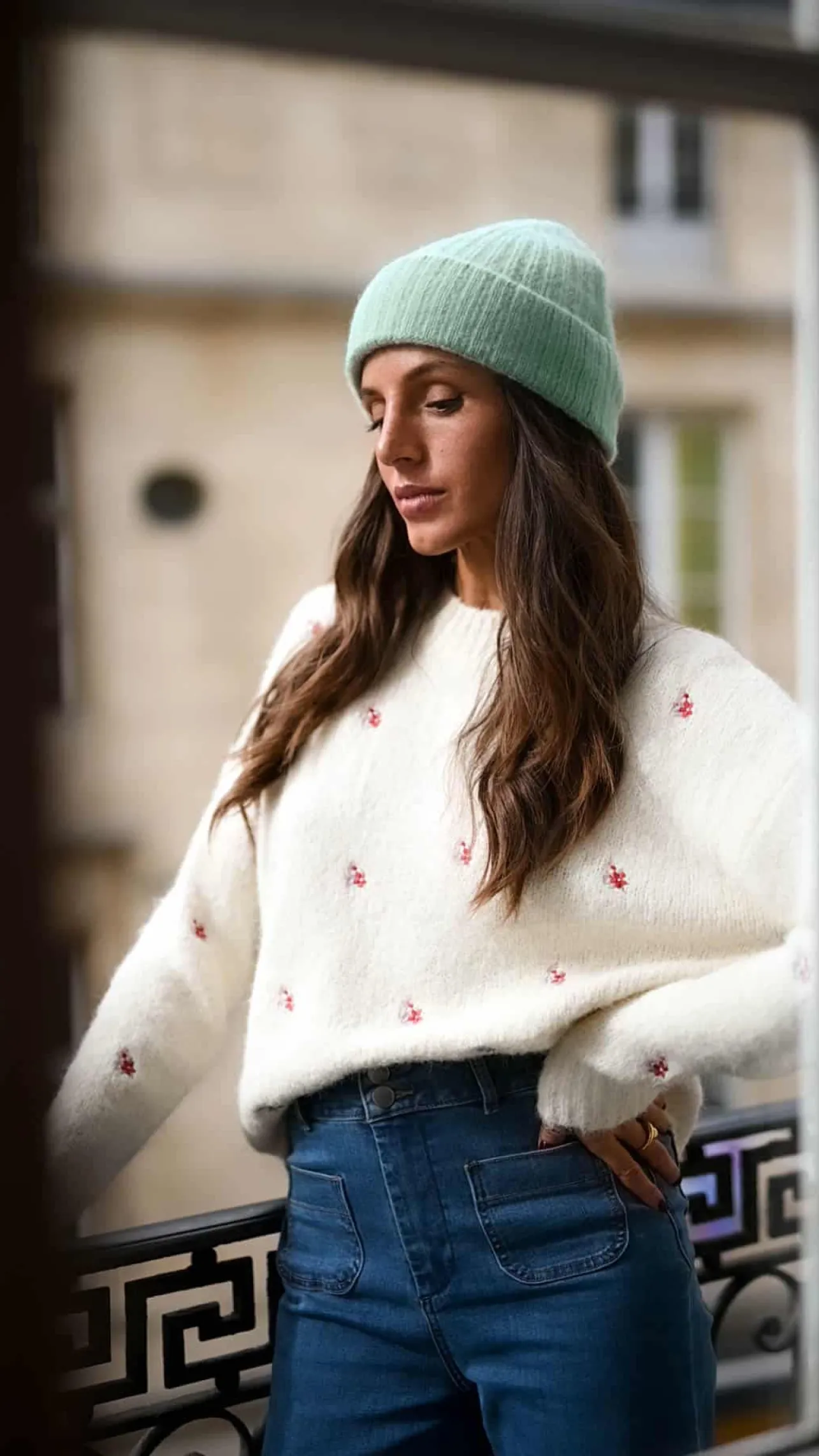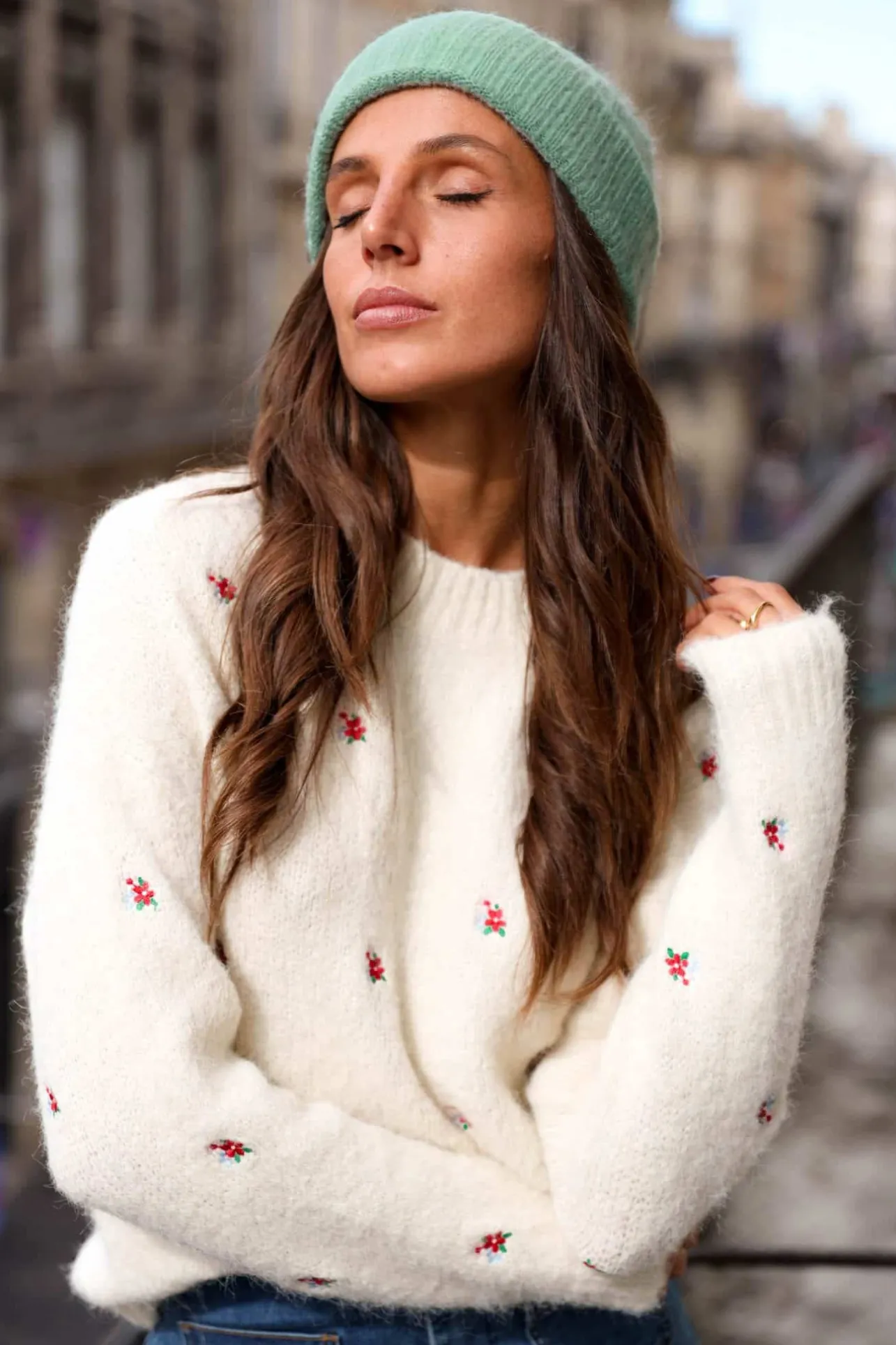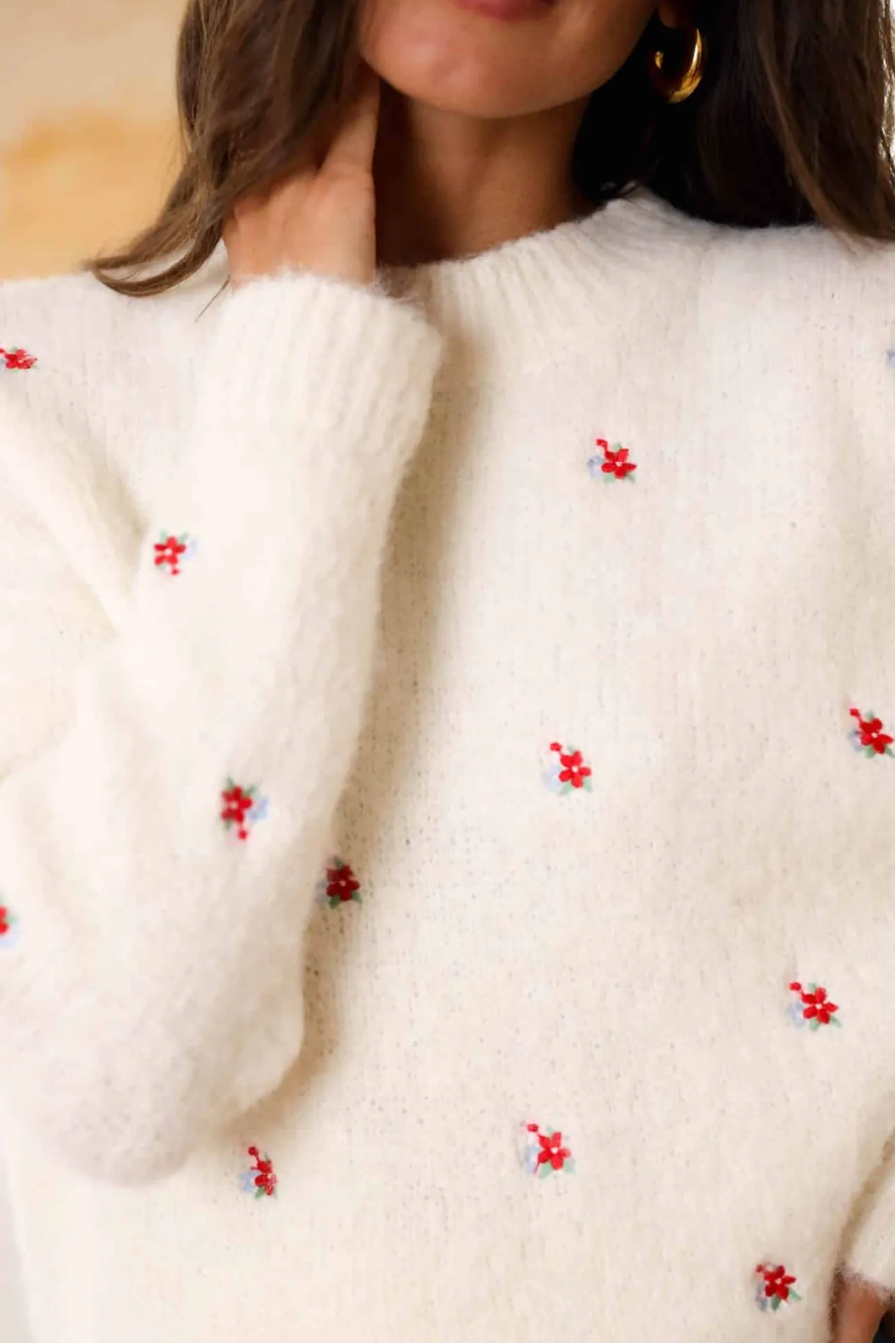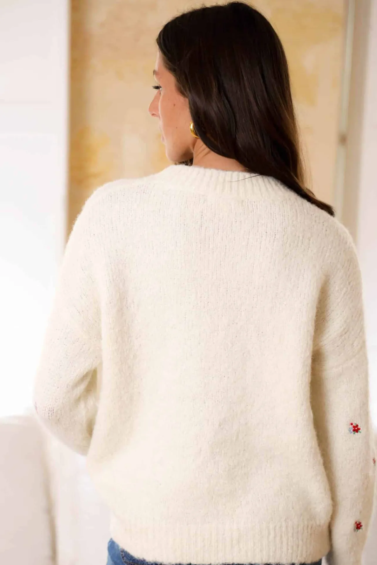 – Pull tout doux– motif fleurs– Col rond– Couleur : écruLe mannequin mesure 1m70 et porte une t…