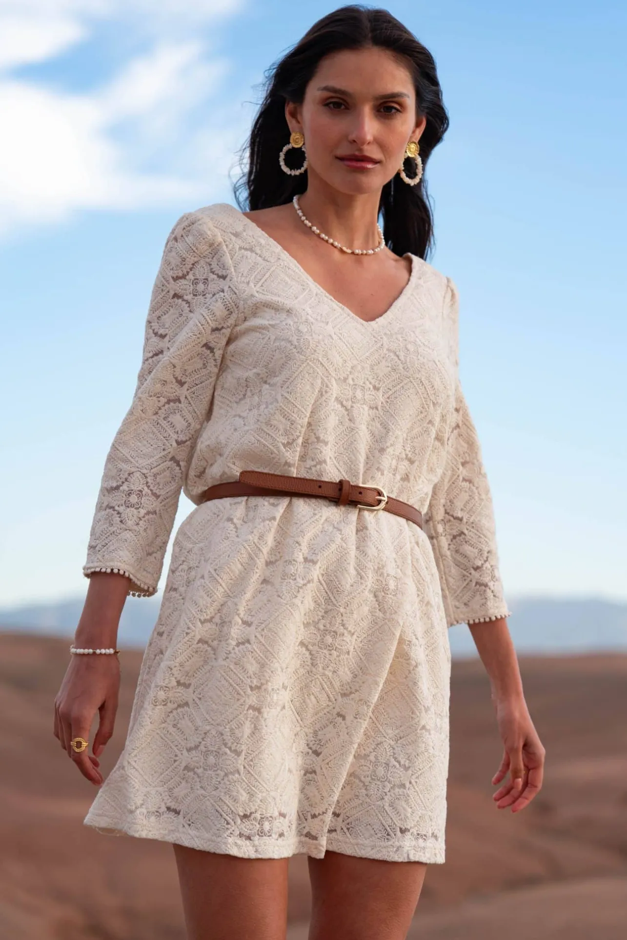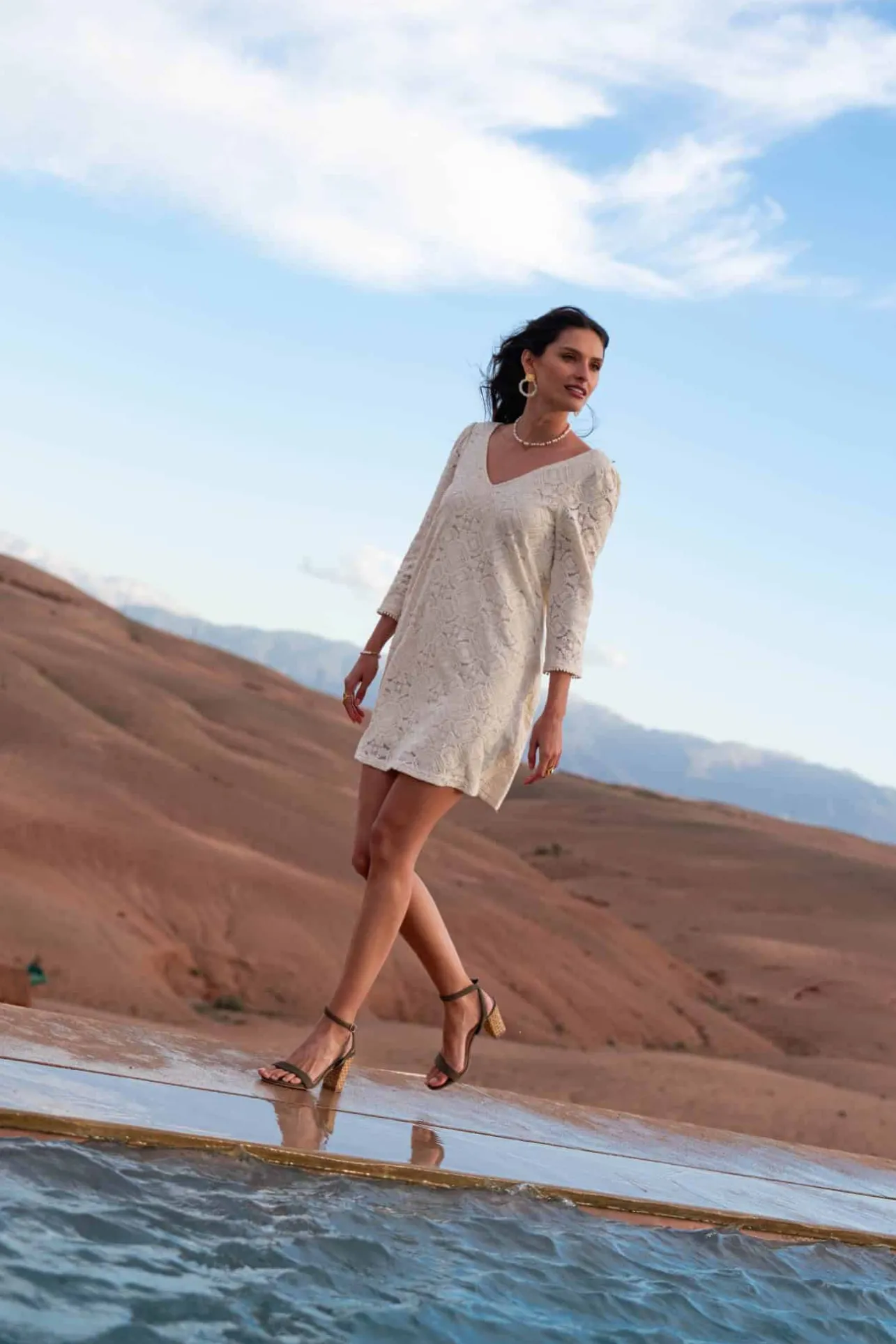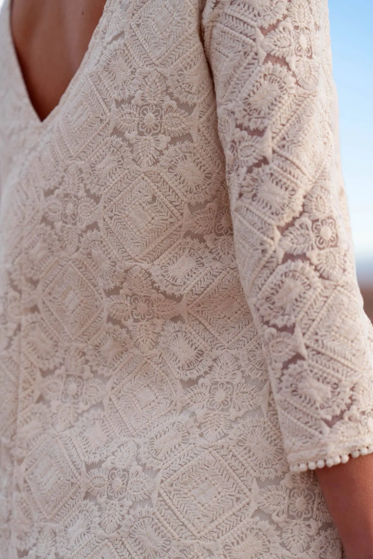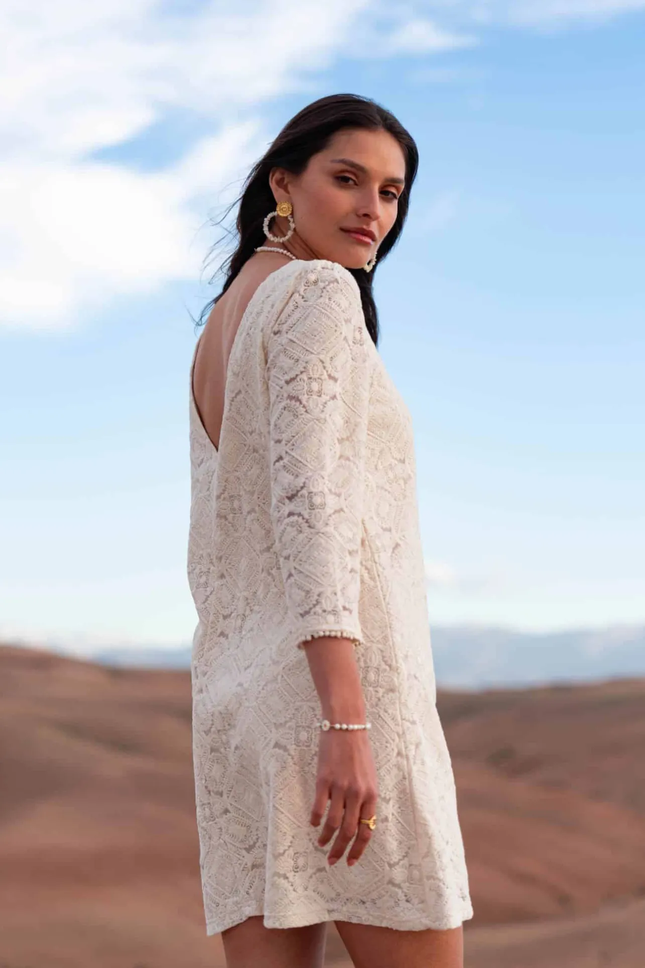 – Robe courtes dos nu– Manches 3/4– Doublée– Broderies fleuries– Couleur : écruLe manneq…