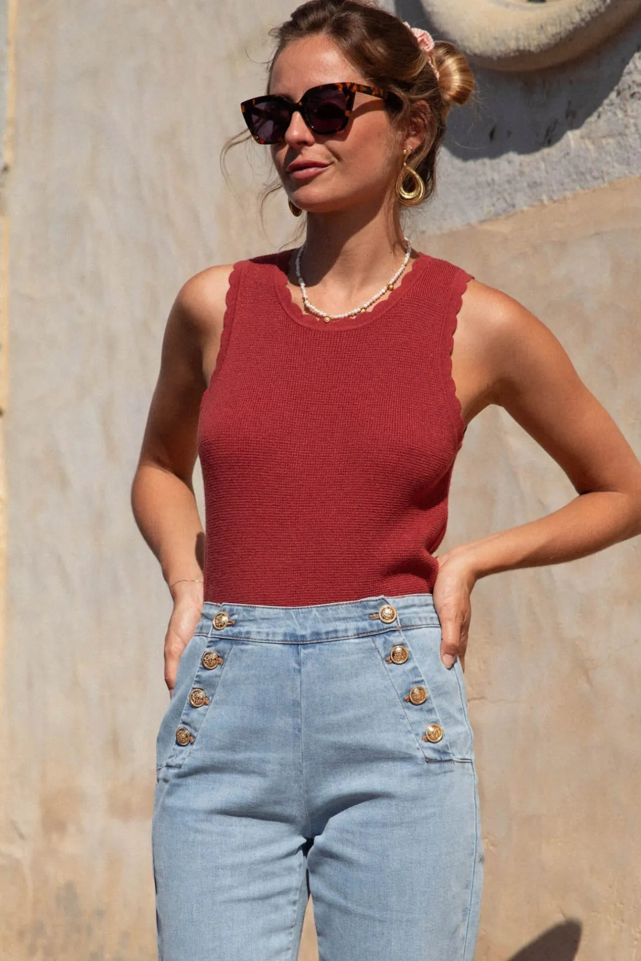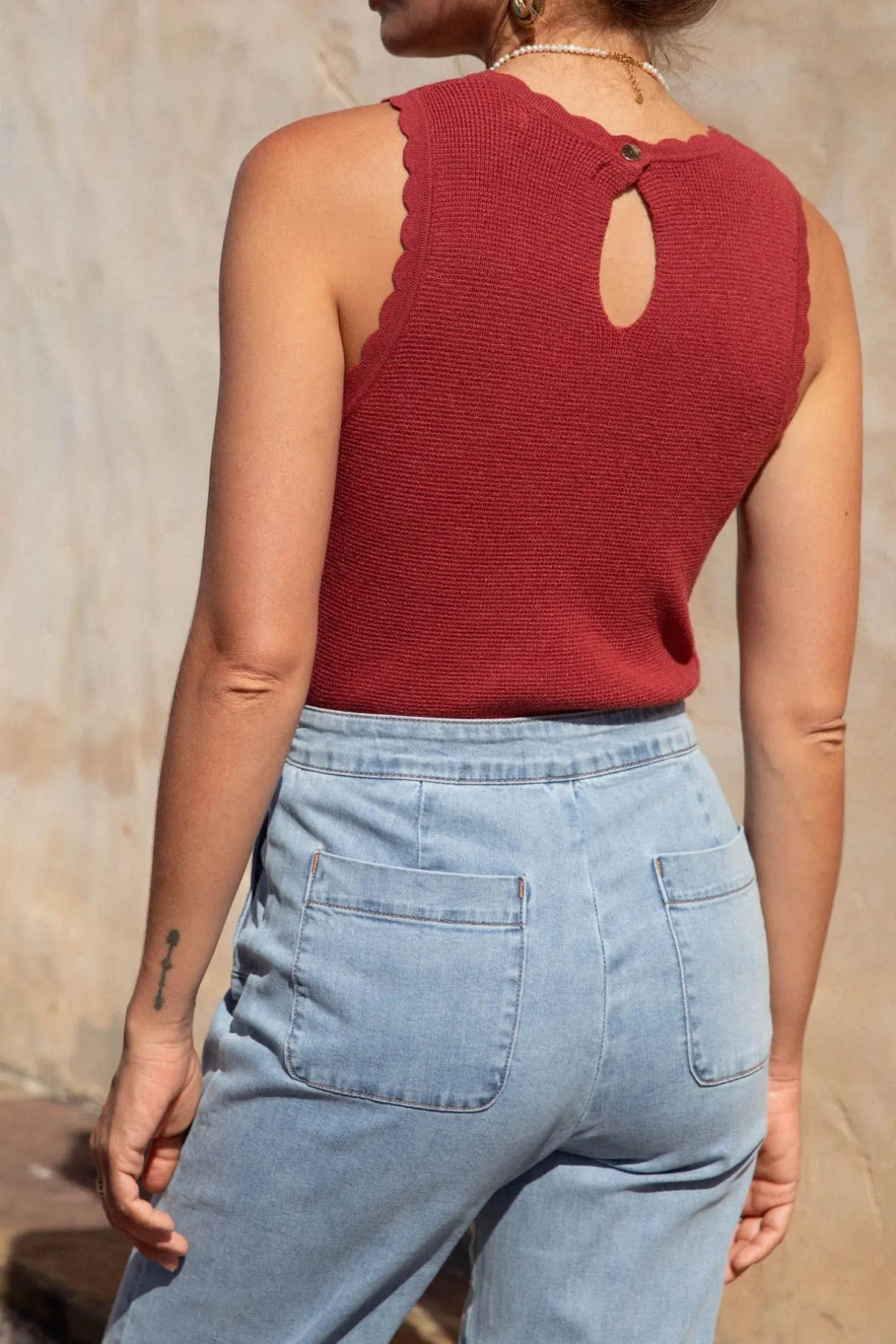 – Top col rond– Sans manches– Bouton doré à l’arrière– Couleur : brique / terracottaLe mann…