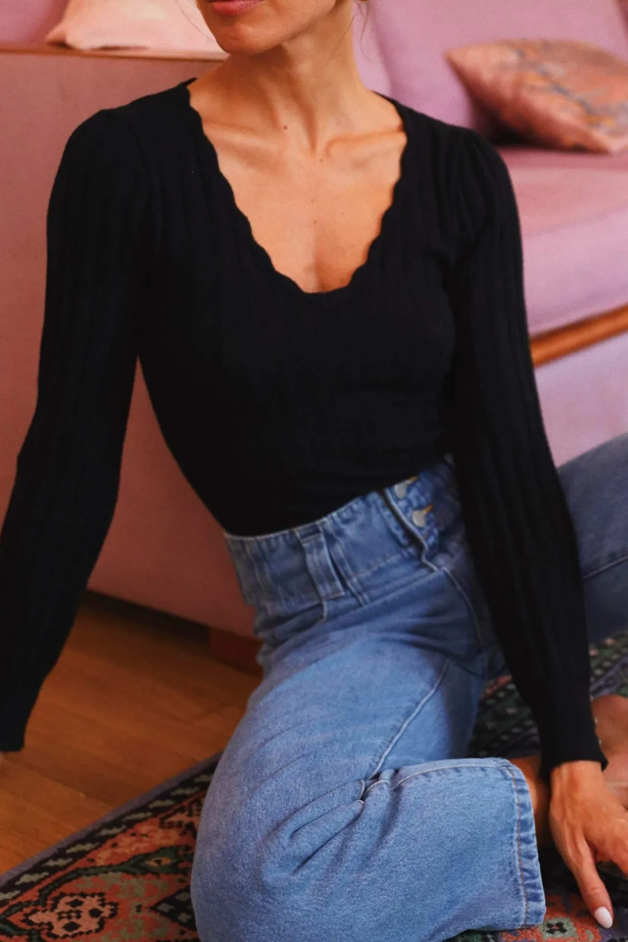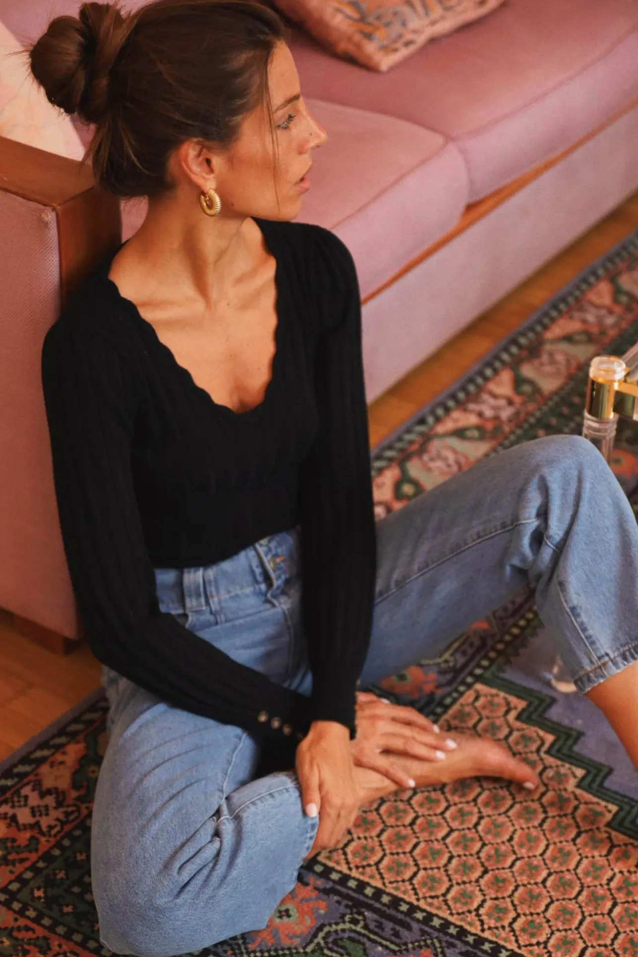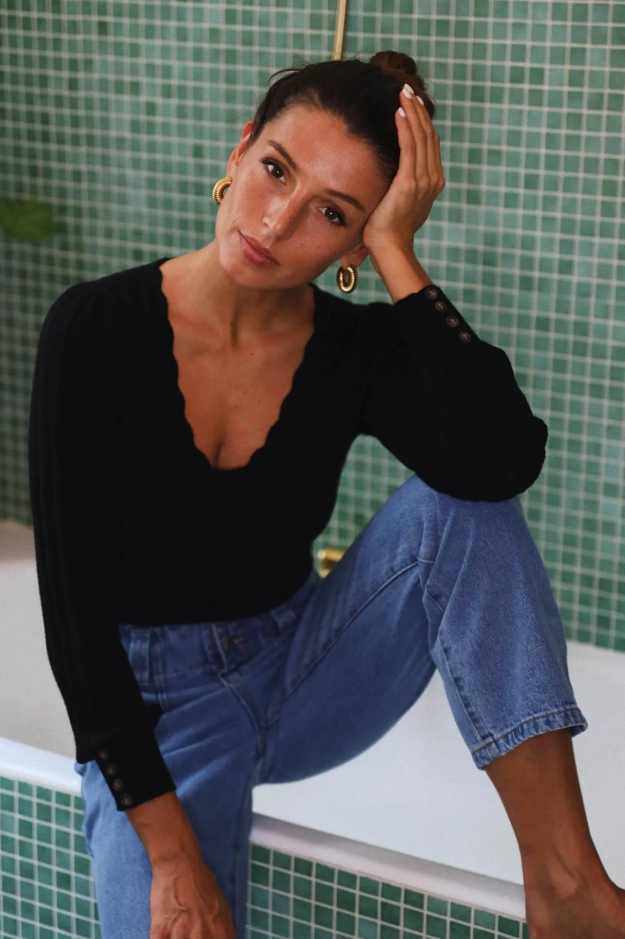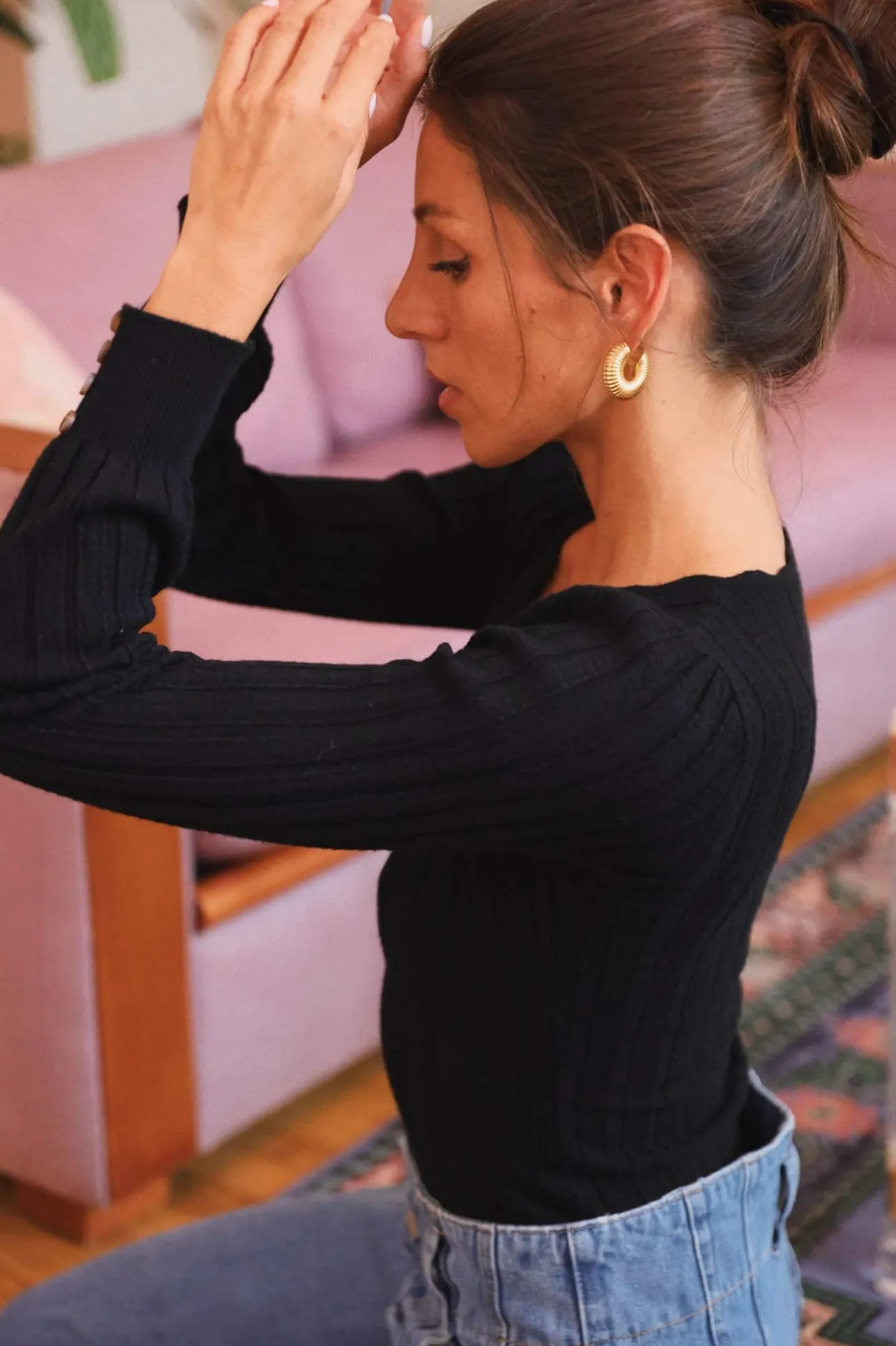 – Top col V– Tout doux– Boutons sur le bout des manches– Couleur : noirLe mannequin mesure 1m70 …