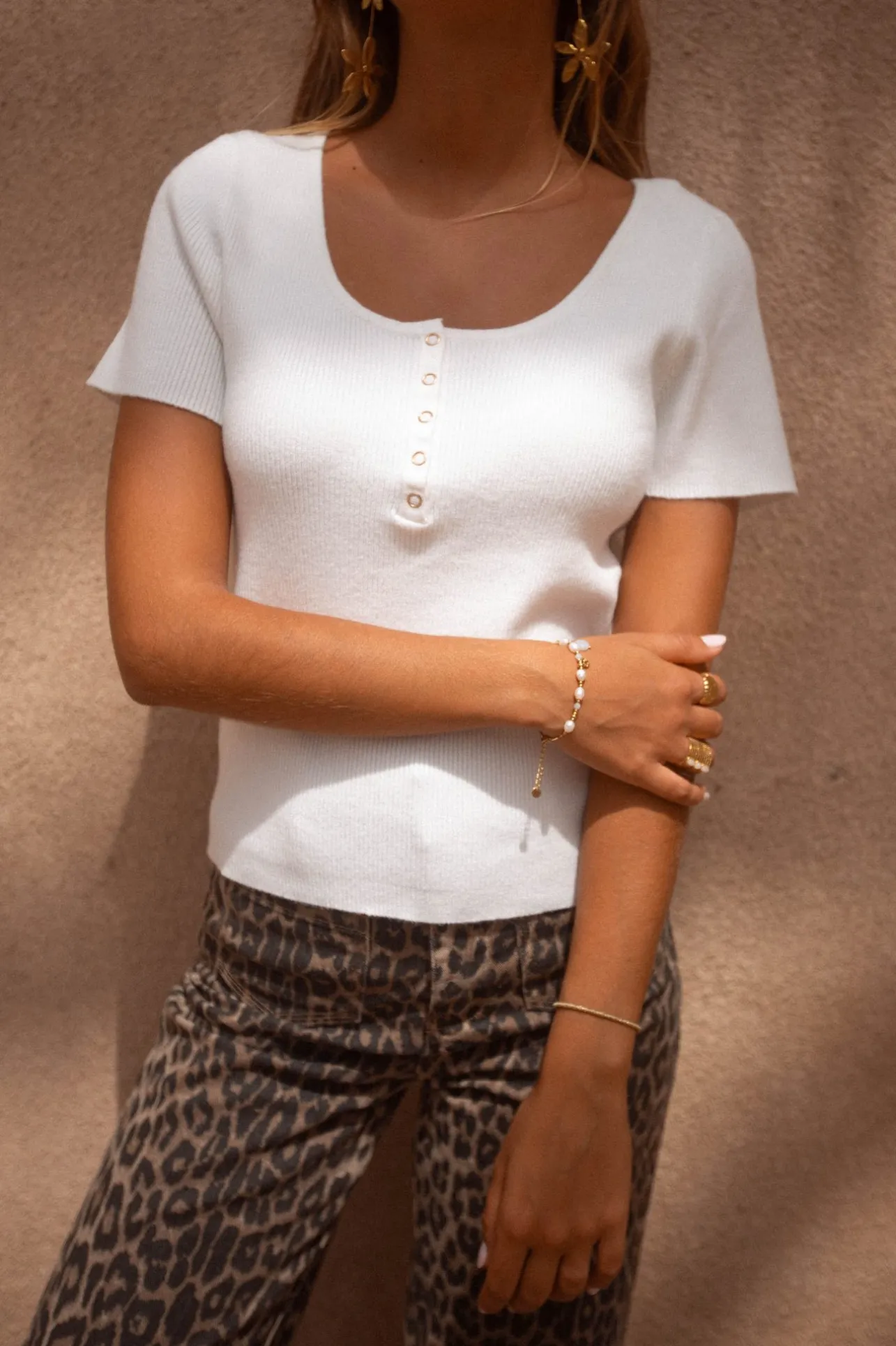 – Top manches courtes– Boutons pressions dorés à l’avant– Couleur : blancLe mannequin mesure 1…