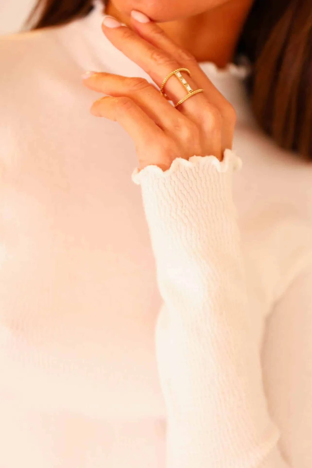 – Top col montant– Tissu tout doux– Coupe droite– Manches longues– Couleur : blancLe manne…