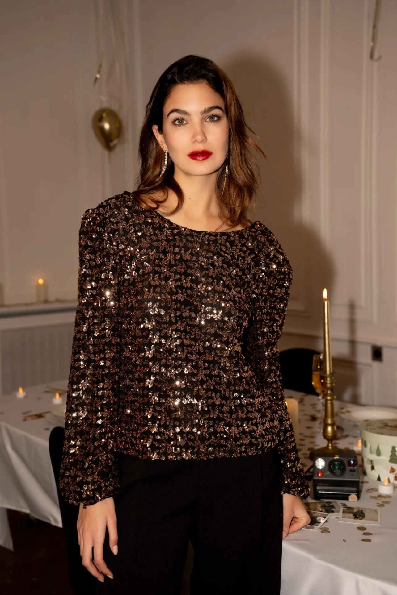 – Top brodé de sequins bronzes– Col rond– Dos nu– Manches longues resserrées aux poignets par …