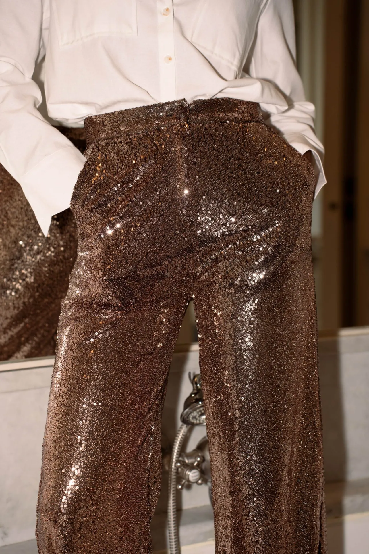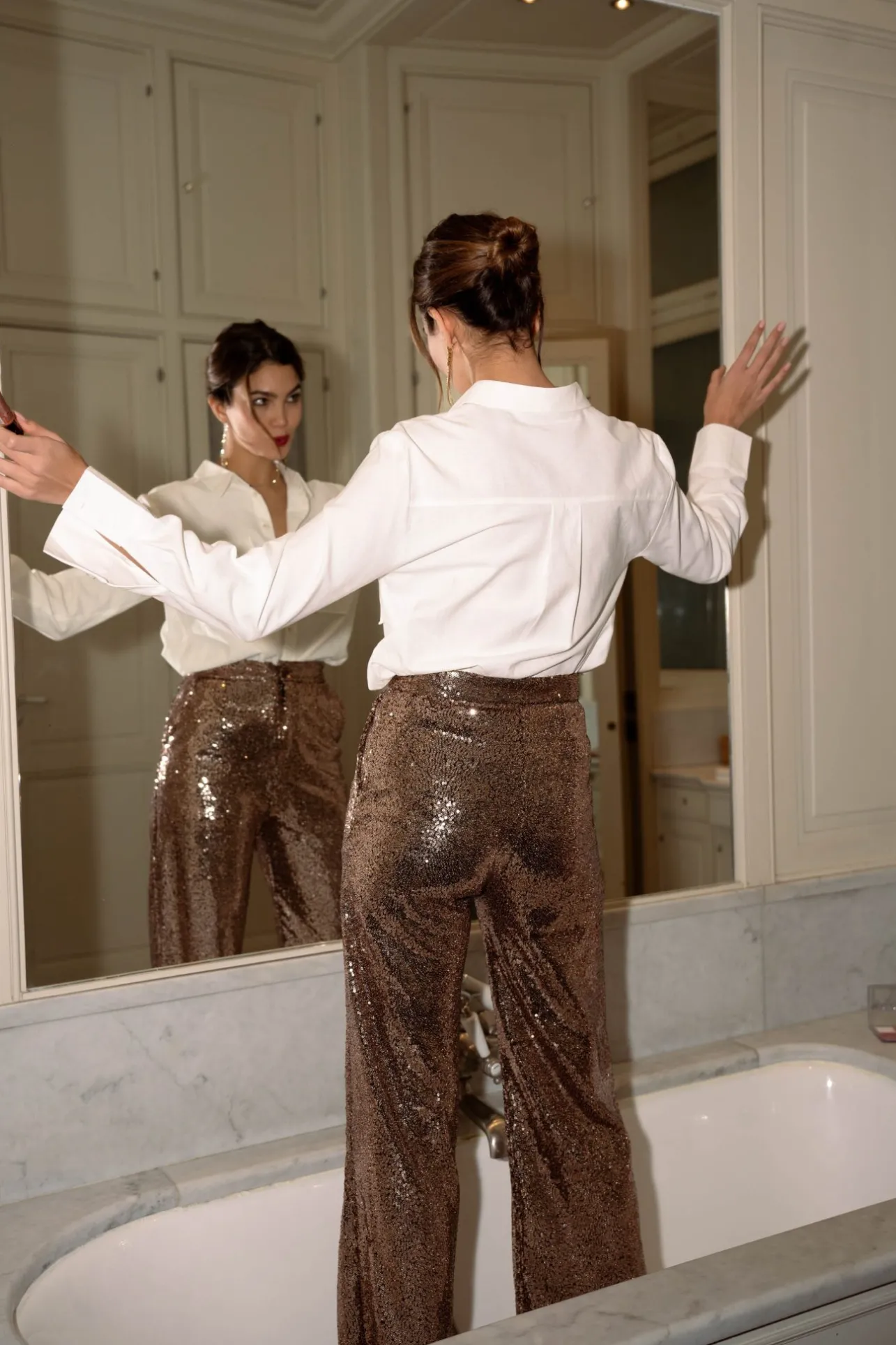 – Pantalon brodé de sequins– Doublé– Légèrement évasé– Deux poches à l’avant–…
