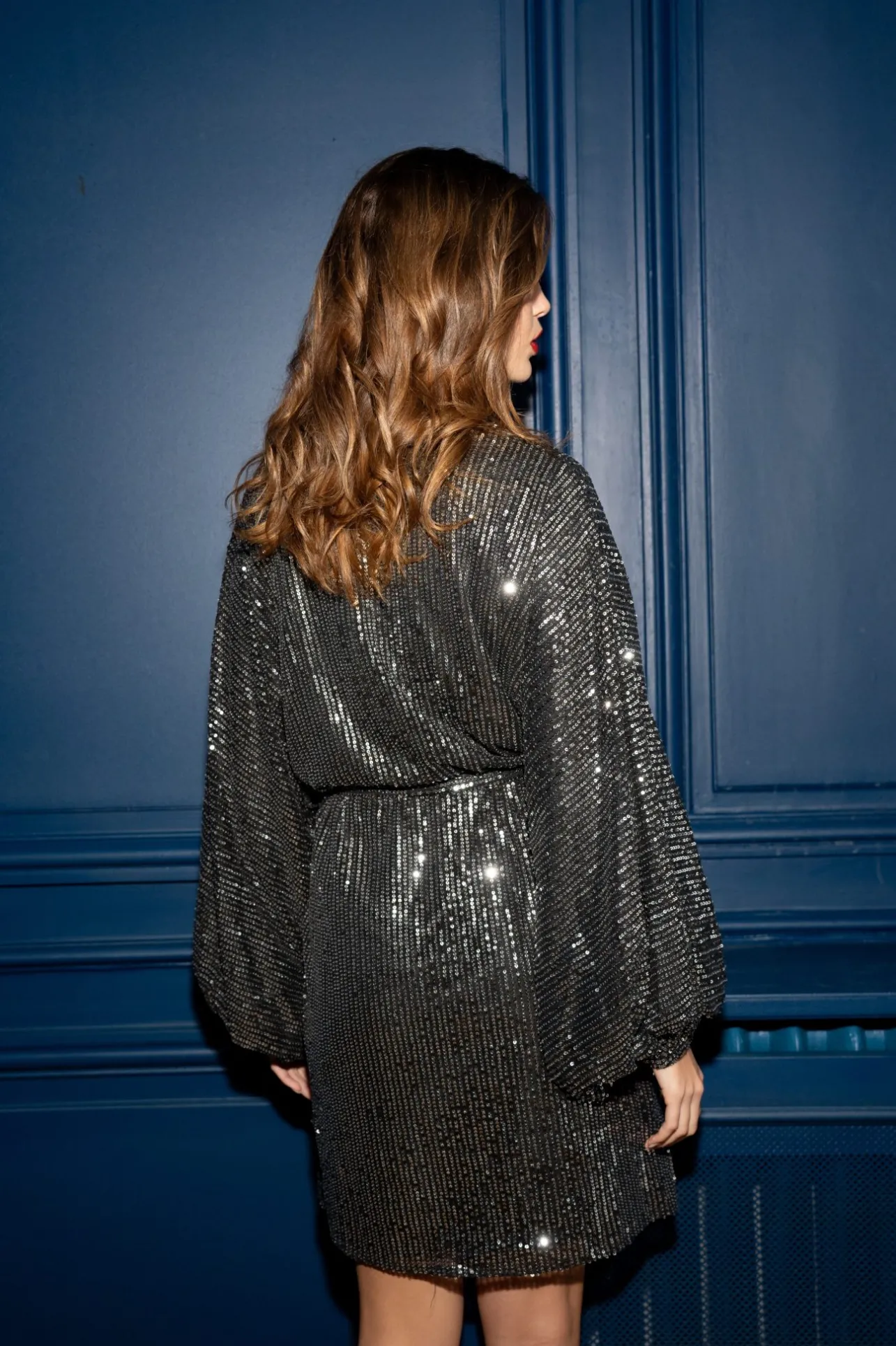 – Robe courte– Col rond– Manches longues resserrées aux poignets par un élastique– Ceinture am…