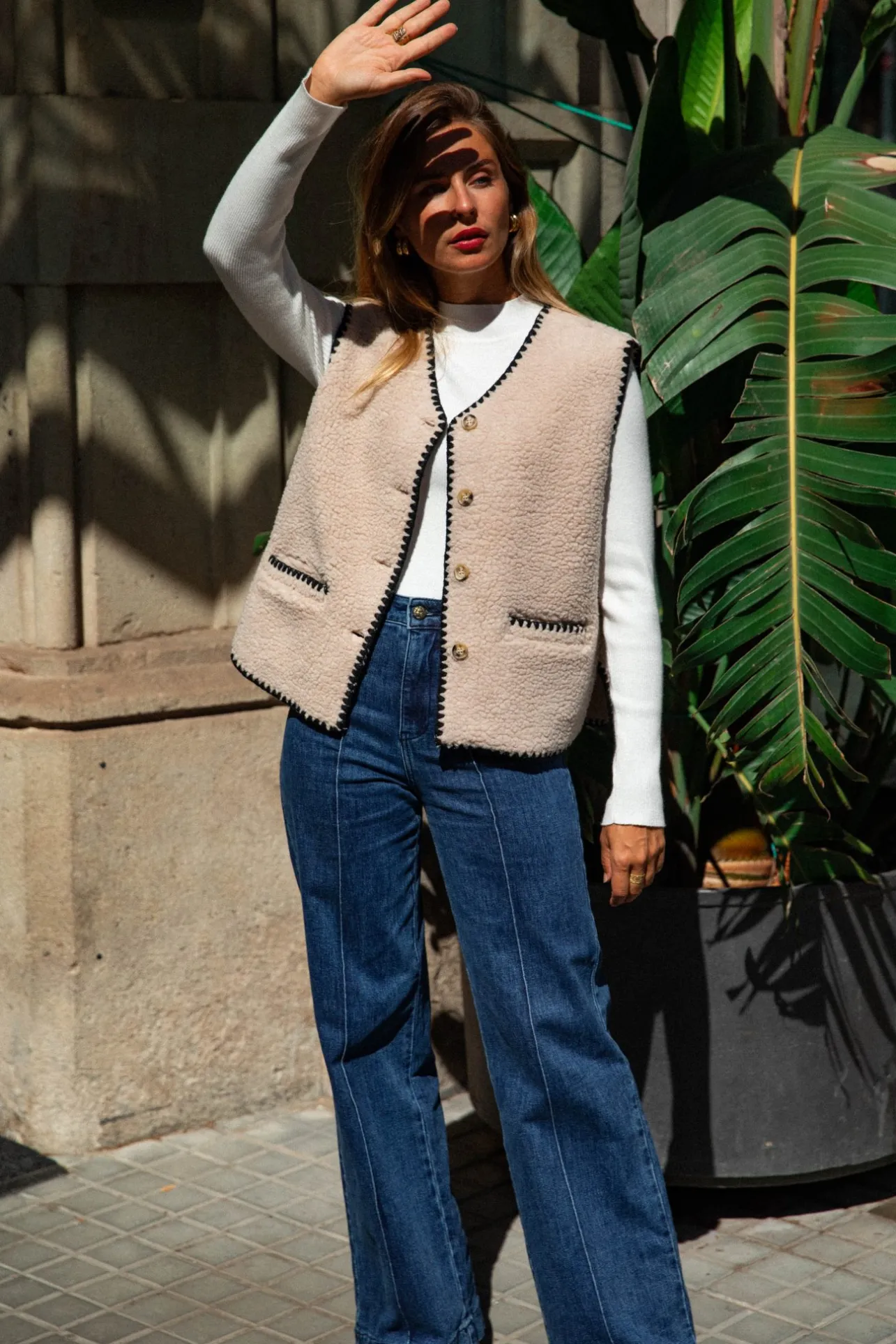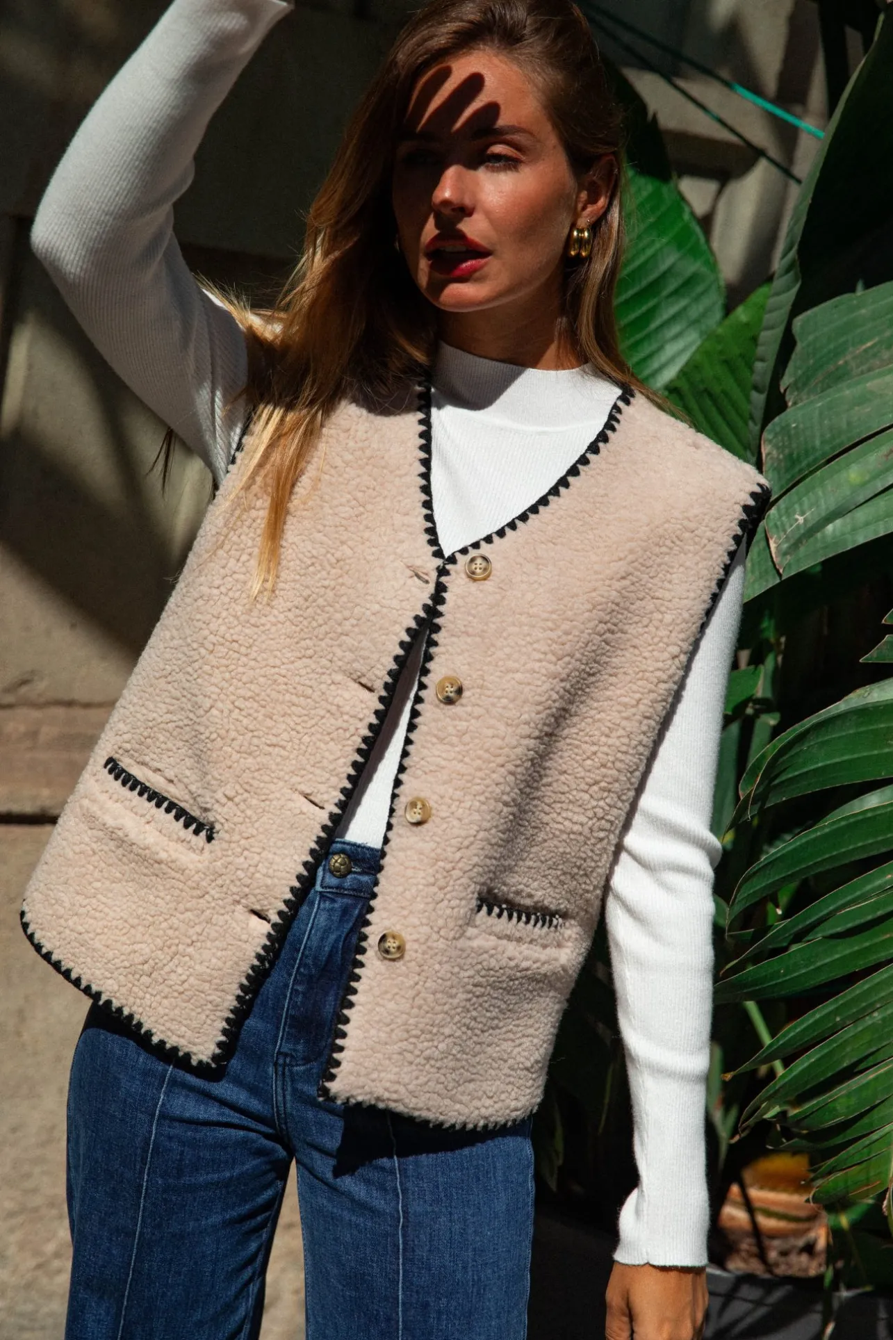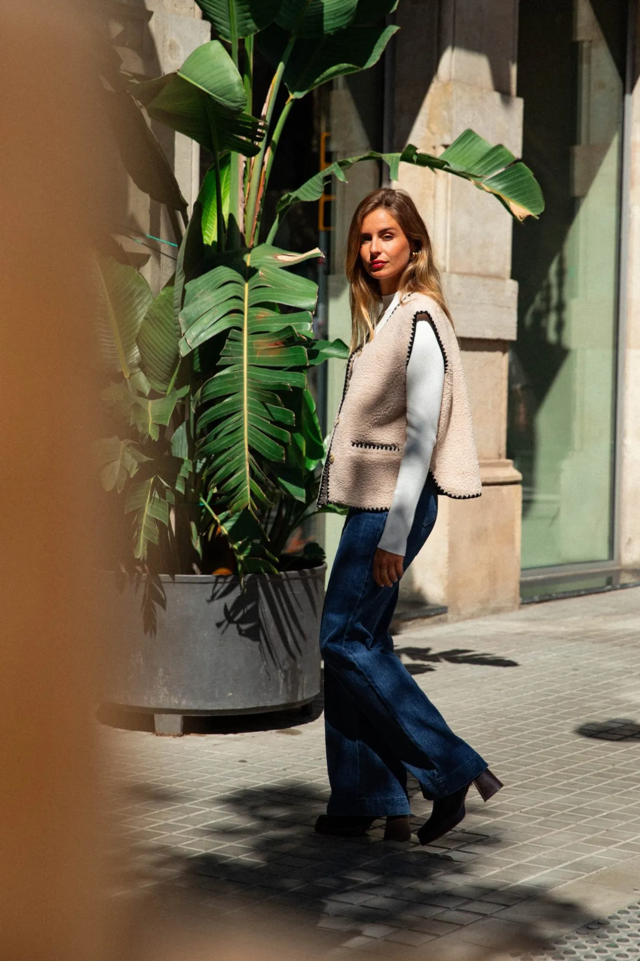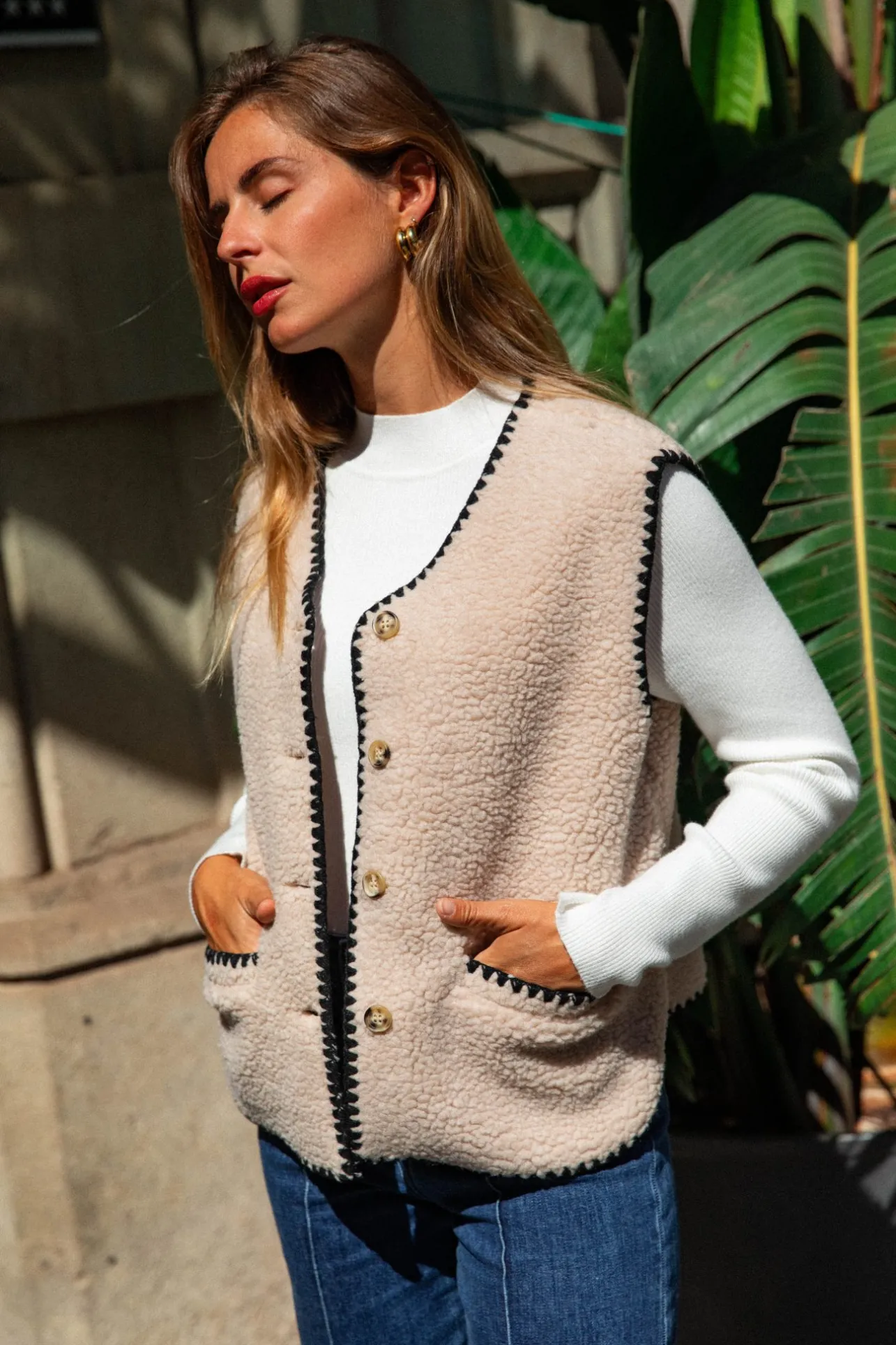 – Gilet effet mouton– Sans manche– Deux poches à l’avant– Couleur : beige et noirLe mannequin…