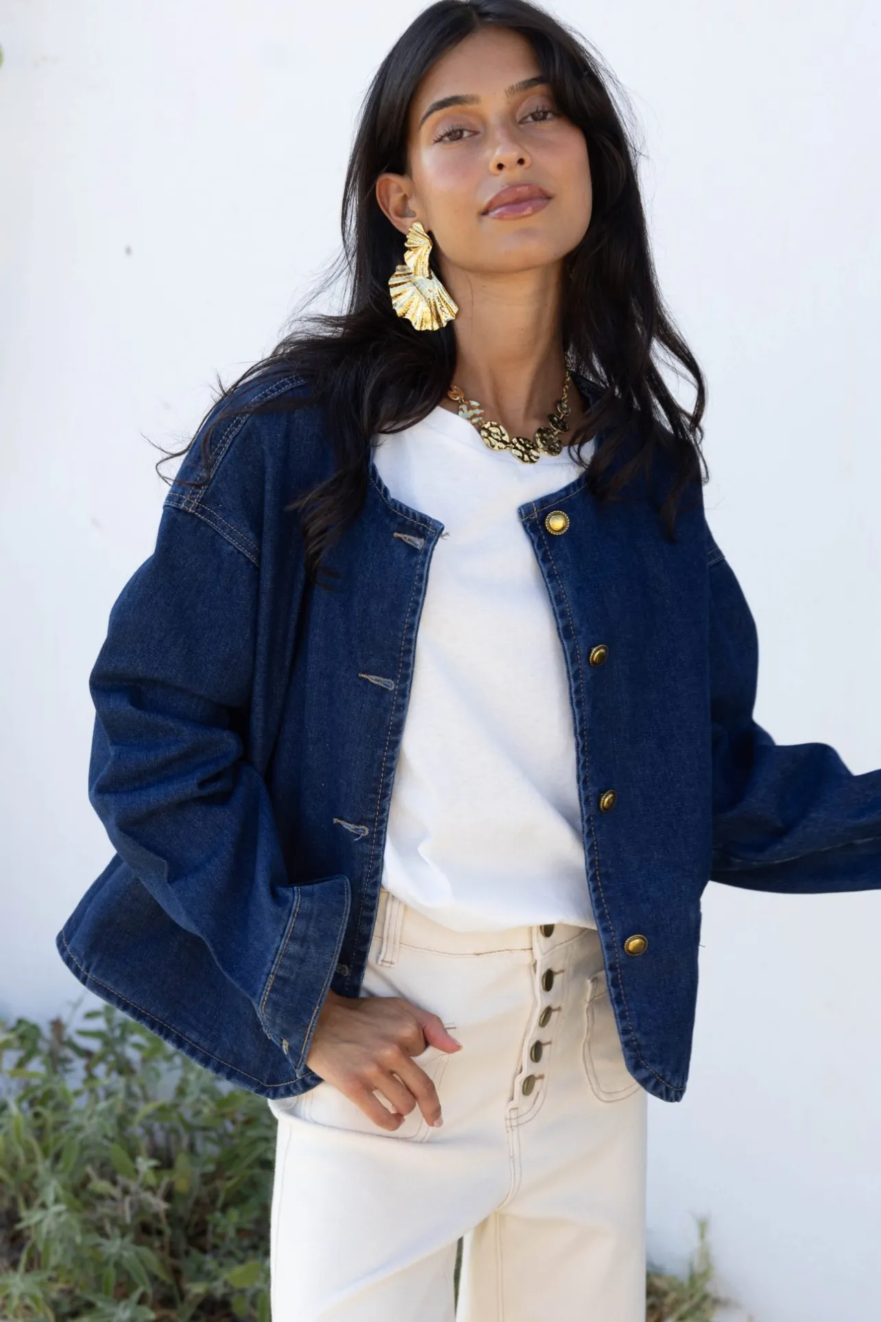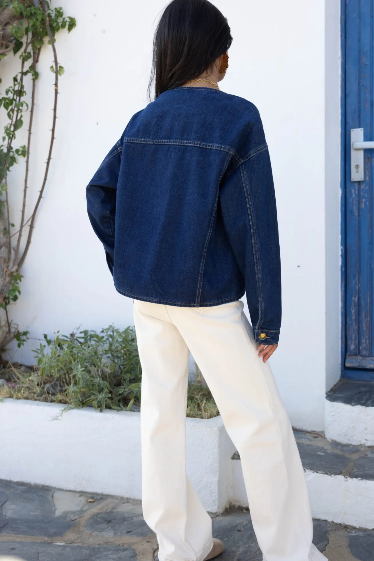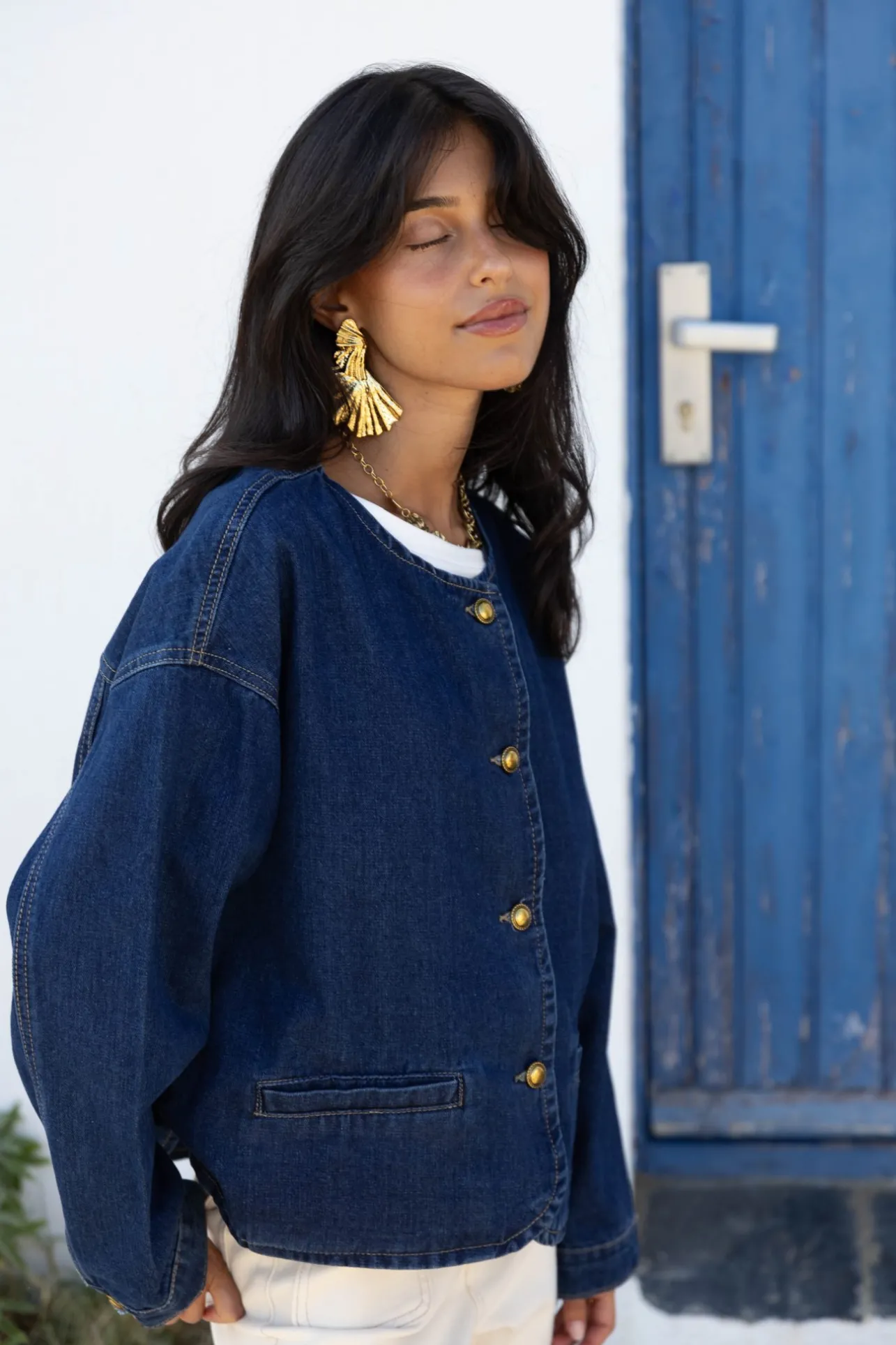 – Veste en jean– Manches longues– Col rond– Fermeture par boutons dorés– Deux poches à l…